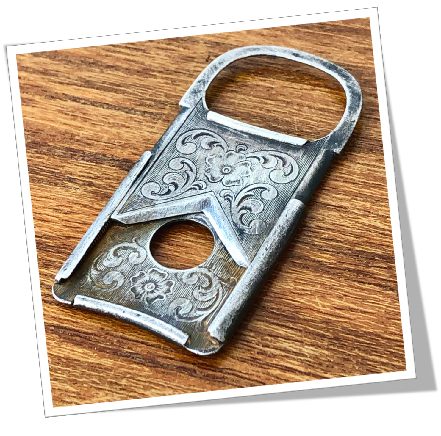 Coupe-Cigare de poche En argent 925, rehaussées d’un décor floral et rinceaux, de style Art Nouveau, ciselés.Guillotine à ressort en V. Mono prise semi-circulaire unilatérale. Hublot circulaire. 5cm.
