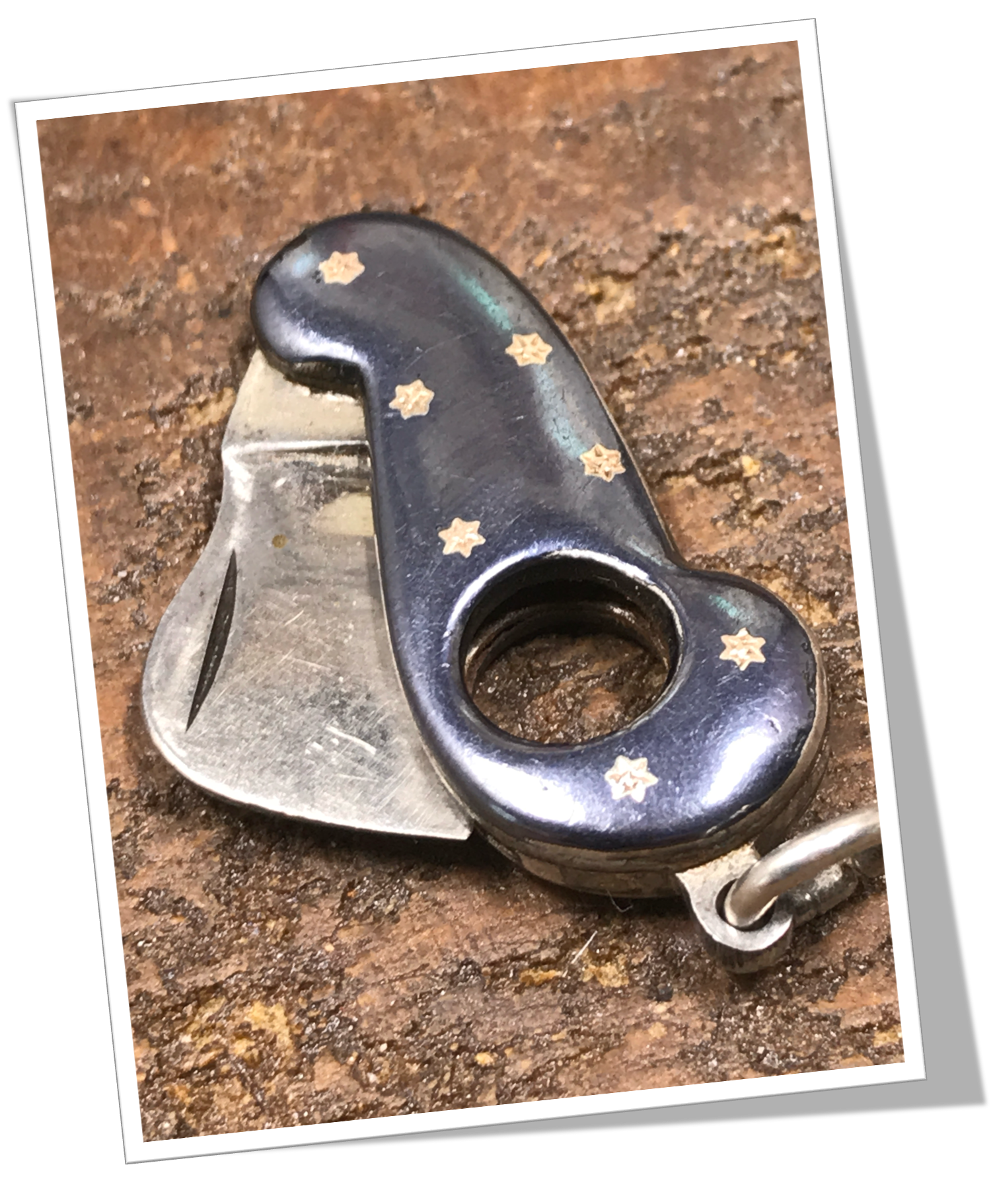 Coupe-Cigare de poche Corne d’abondance à côtes bombées et appliquées en argent 925 niellé. Étoiles insert dorés.Lame guillotine à ressort. Bélière.