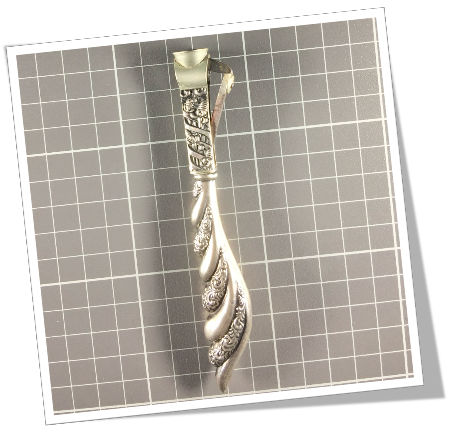 Coupe-Cigare de table En argent 925. Manche en argent 925 rehaussé d’un relief d’ornements de style Art Nouveau en technique « repoussé ».En acier. Manche long agrémenté d’une tête ancienne de type Cat-Eye (V-Cut) rehaussée d’un bouton circulaire. 13cm.