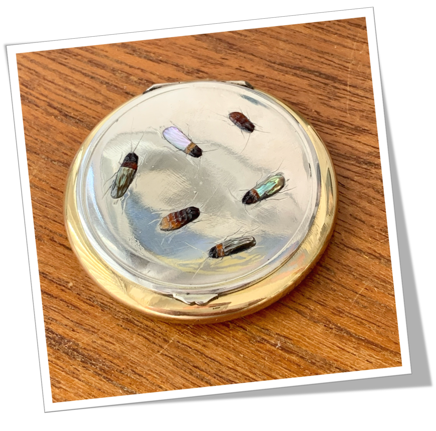 Poudrier En métal doré et de forme circulaire. Lisse poli miroir et agrémenté d’insectes de style Shibayama, appliqués au recto.Capot à zéro. Miroir et filtre à l’intérieur.