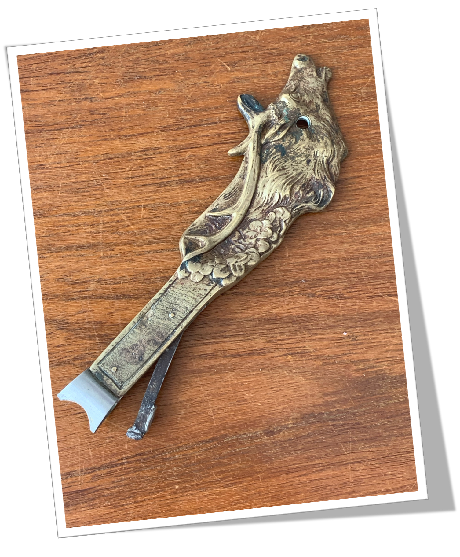 Coupe-Cigare de table En laiton et de style Novelty animalier Viennois. Manche zoomorphe, moulé et texturé, en relief d’un buste de renne.En acier. Manche long agrémenté d’une tête ancienne de type Cat-Eye (V-Cut) rehaussée d’un bouton circulaire. 16cm.
