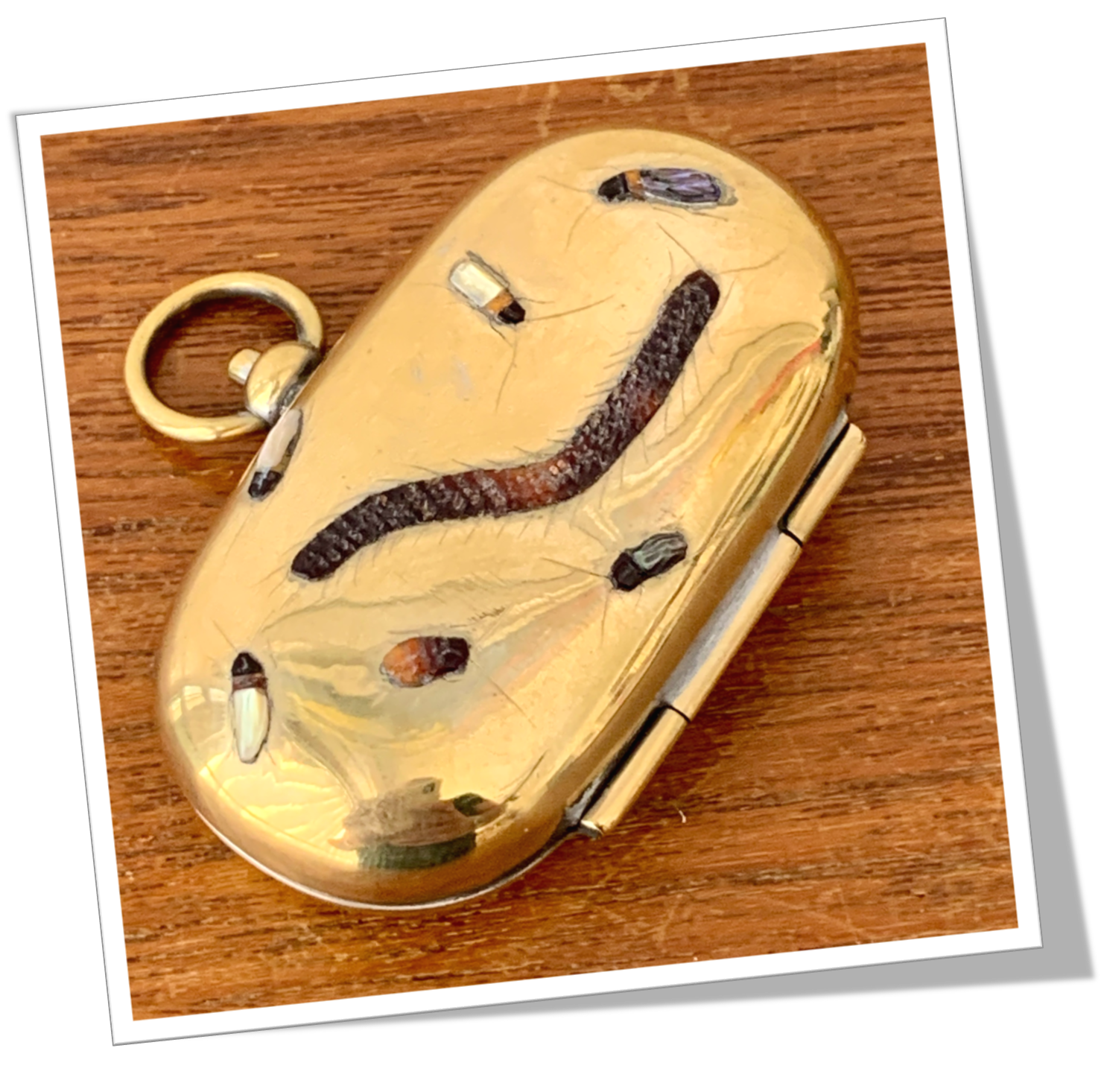 Boîte à Sovereign En métal doré et de forme ovoïde. Agrémenté au recto d’un mille-pattes et d’insectes appliqués, de style Shibayama. Platines à sovereign guillochées.Capot 1/2 1/2. Double récepteur à sovereign. Anneau frontal avec bouton de relâchement.
