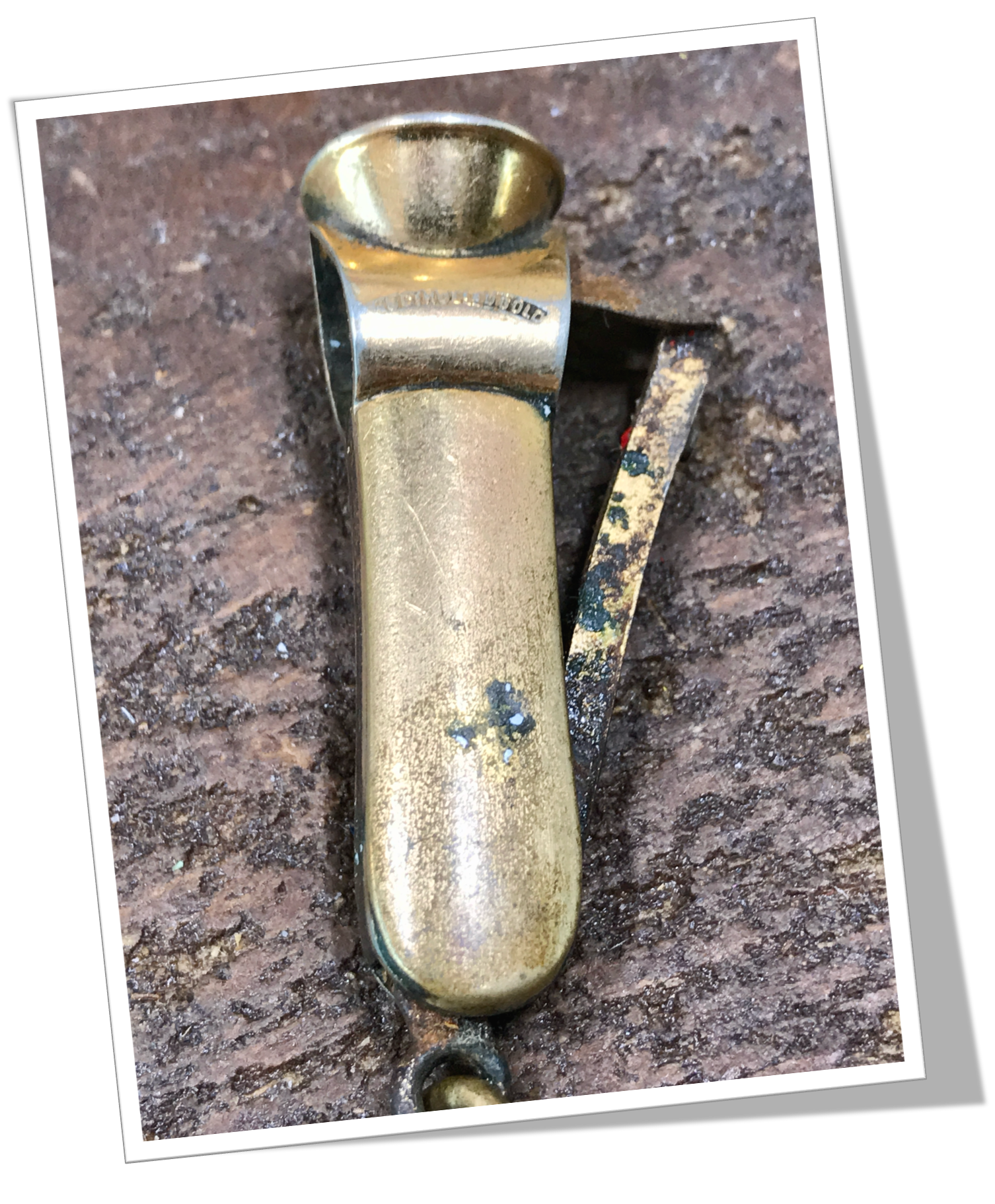 Coupe-Cigare de poche Côtes appliquées en métal doré.En métal doré. Manche court agrémenté d’une tête ancienne de type Cat-Eye (V-Cut) rehaussée d’un bouton circulaire et d’un anneau levier avec bélière. 4cm.