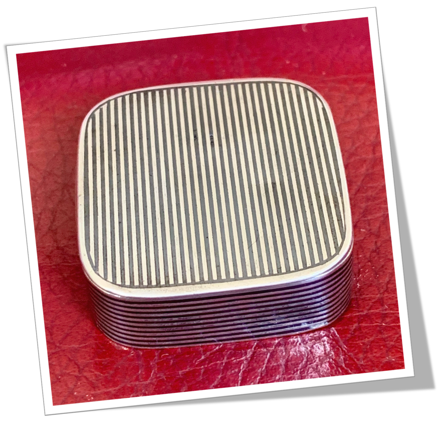 En argent 925 niellé et de forme carré. Rehaussée de bandes horizontales niellées et agrémentée dans son intérieur niellé, du monogramme « R.E 21 Juli 1910 ».