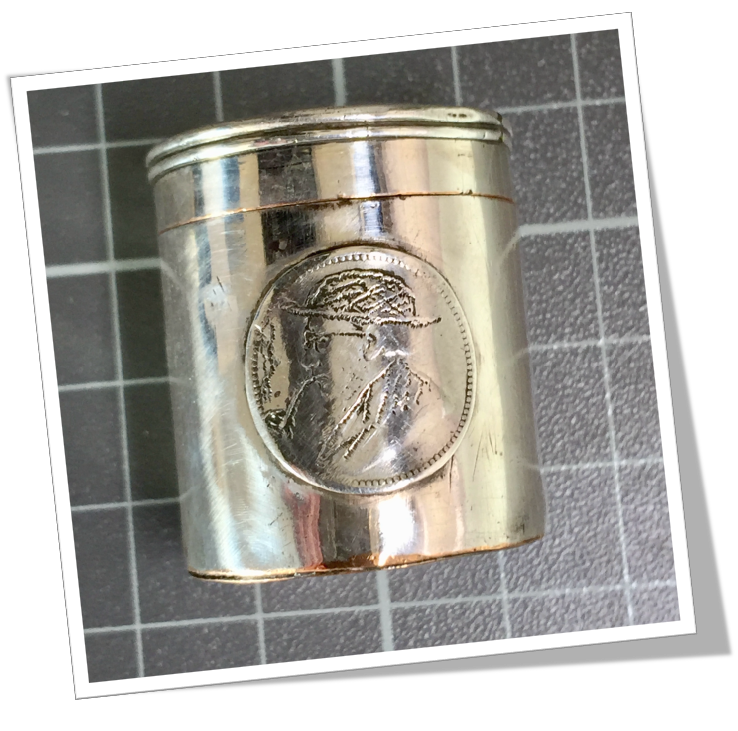 Tabatière de poche En argent 925 et de forme circulaire. Lisse poli miroir. Pièce en argent 900 appliquée. Paul Kruger type « Boer coin » Afrique du Sud. Couvercle 1/5 4/5.