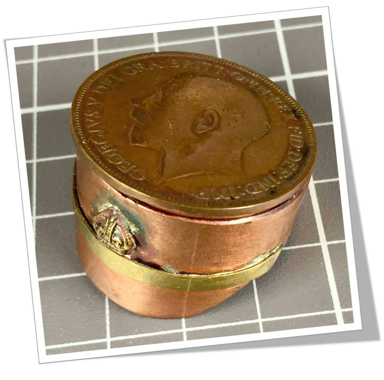 Tabatière de poche En laiton et en forme de képi militaire. Pièces appliquée. Décoration militaire sur la tranche George V 1 Penny, Grande Bretagne. Style Trench-Art.Couvercle à zéro.