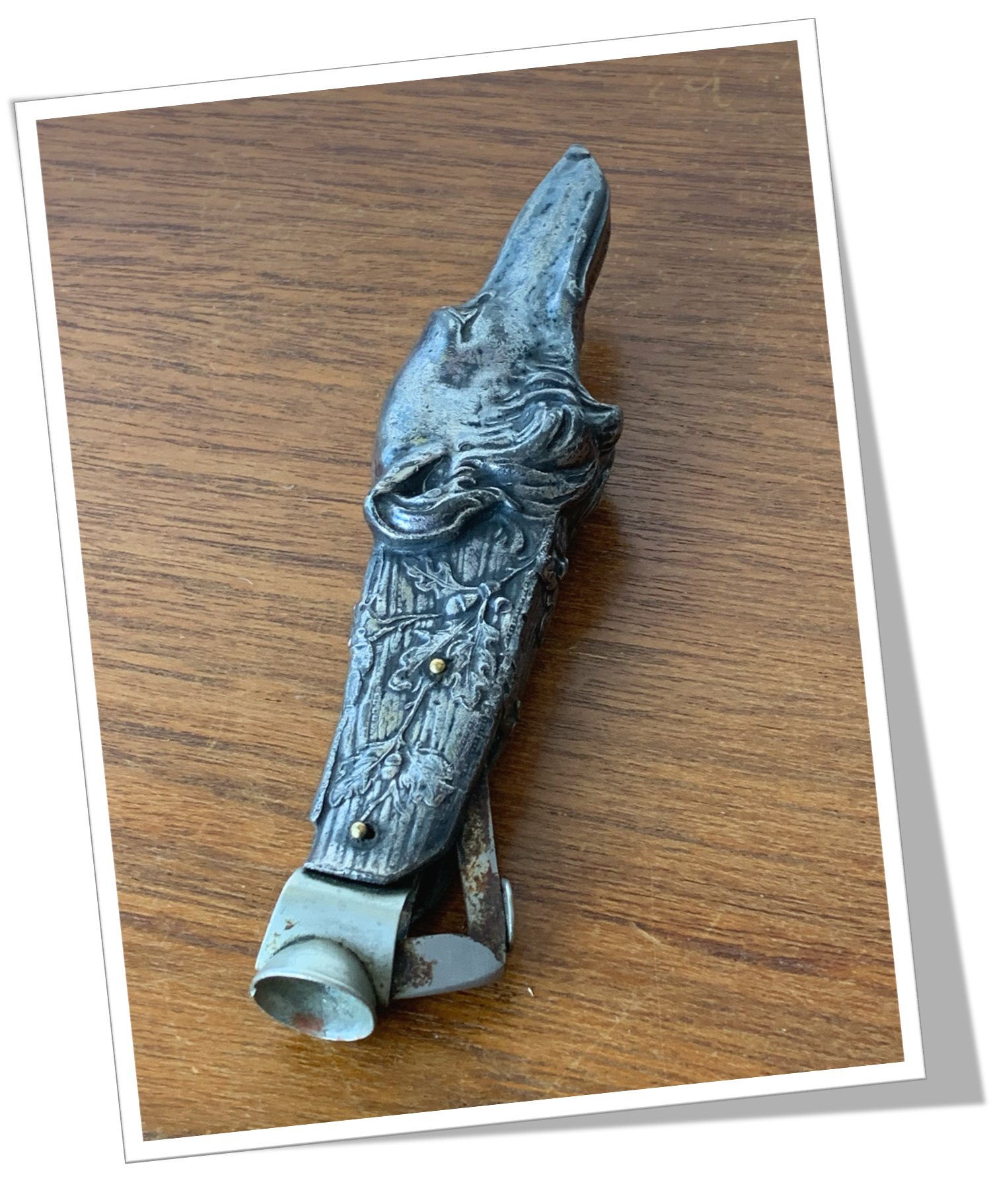 Coupe-Cigare de table Moulé et texturé en forme de tête de chien de chasse en métal argenté. Décor floral. De style Novelty animalier.En métal argenté. Manche long, agrémenté d’une tête ancienne de type Cat-Eye (V-Cut), rehaussée d’un bouton circulaire. 15cm.