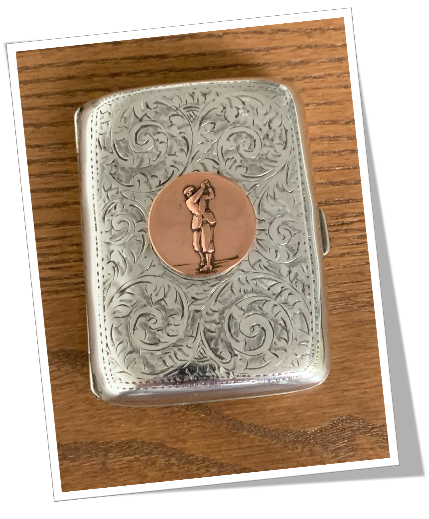En argent 925 et de forme rectangulaire. Rehaussée d’un décor de rinceaux ciselés, agrémentée au recto d’un médaillon circulaire cuivré représentant un golfeur en action. Galbé à l’arrière. Intérieur gilt vermeil. 72,7g.
