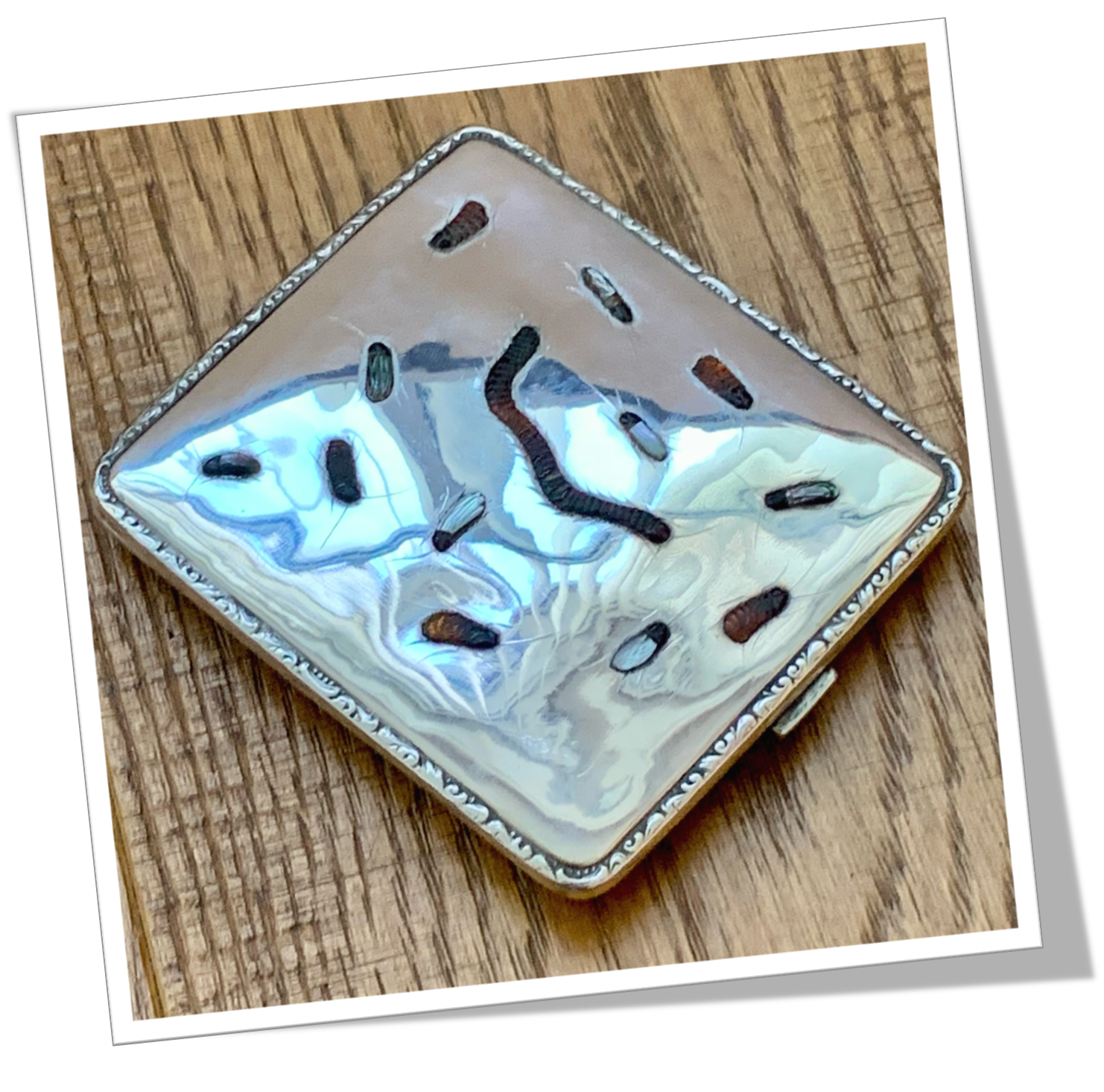 Étui à cigarettes En argent 835 et de forme rectangulaire. Rehaussé sur ses deux faces d’un encadrement d’ornements ciselés et, agrémenté au recto d’insectes et mille-pattes appliqués (souvent en ambre, nacre, émaux colorés, etc) et de style Shibayama, faisant référence à une technique décorative japonaise développée à l’époque Edo (1603-1868) et porte le nom de Shibayama Senzo, un artiste réputé pour avoir popularisé cette méthode. Intérieur « gilt » vermeil dépassé. 71,20gr.Capot 1/2 1/2 par bouton poussoir de relâchement.