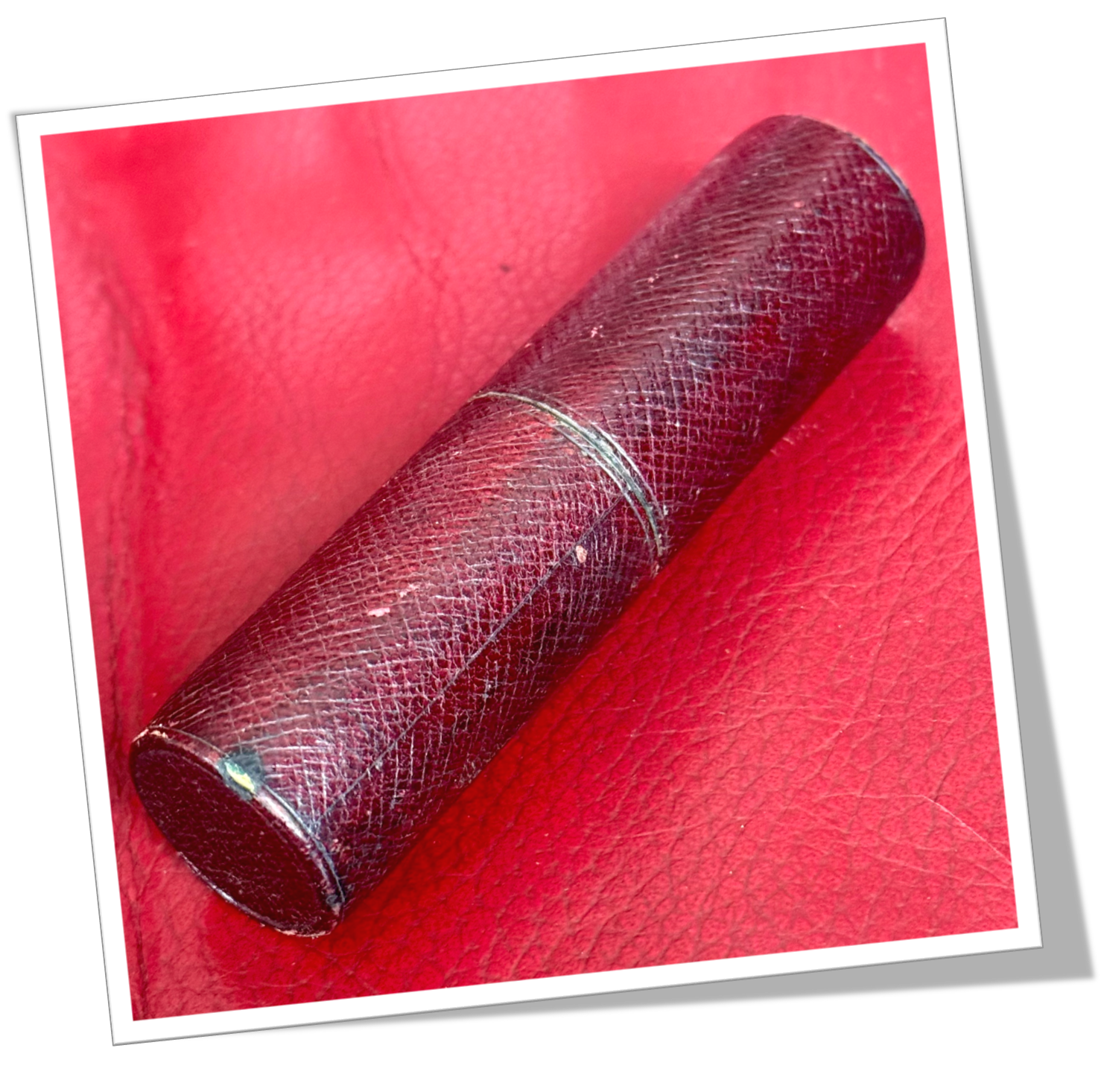 Étui à pièces d’or En laiton gainé de cuir bordeaux et de forme cylindrique longue, un étui à pièces de 20 francs or.Bouchon 1/5 4/5.