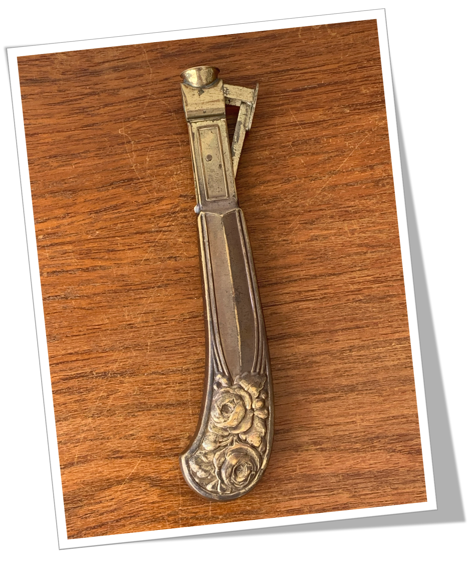 Coupe-Cigare de table Côtes rivetées en laiton, rehaussées d’un relief de style art Nouveau, en technique « repoussé ».En acier. Manche long agrémenté d’une tête ancienne de type Cat-Eye (V-Cut), rehaussée d’un bouton circulaire à sillons. 15cm.