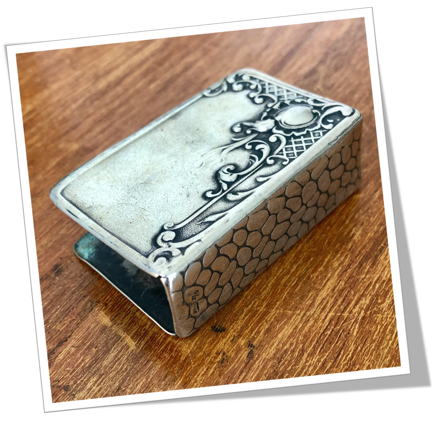 Étui à boîte d’allumettes En argent 925 et de forme rectangulaire. Agrémenté au recto de rinceaux en technique « repoussé » et rehaussé au verso d’un guillochis « galets ».Reliure.