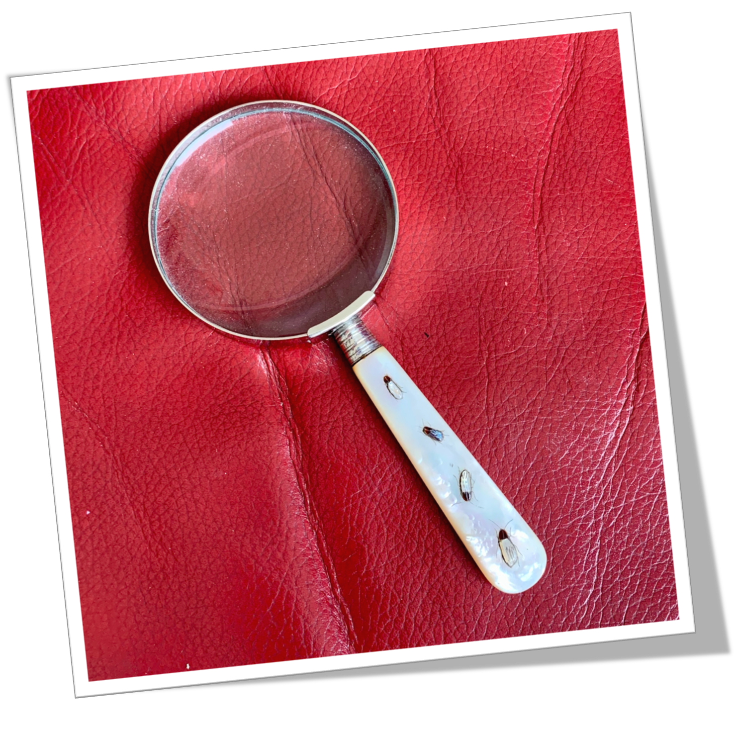 Loupe Manche en nacre agrémenté d’insectes de style Shibayama, appliqués.Verre grossissant, manche.