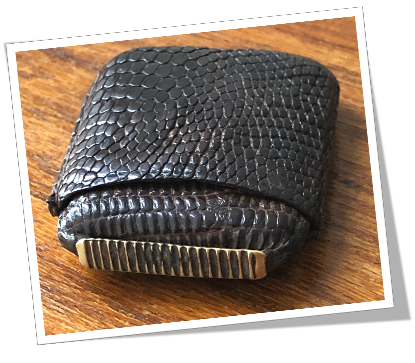Pyrogène Vesta Case En peau de lézard. De forme rectangulaire. Haute par dessus. Grattoir plat appliqué à la base.