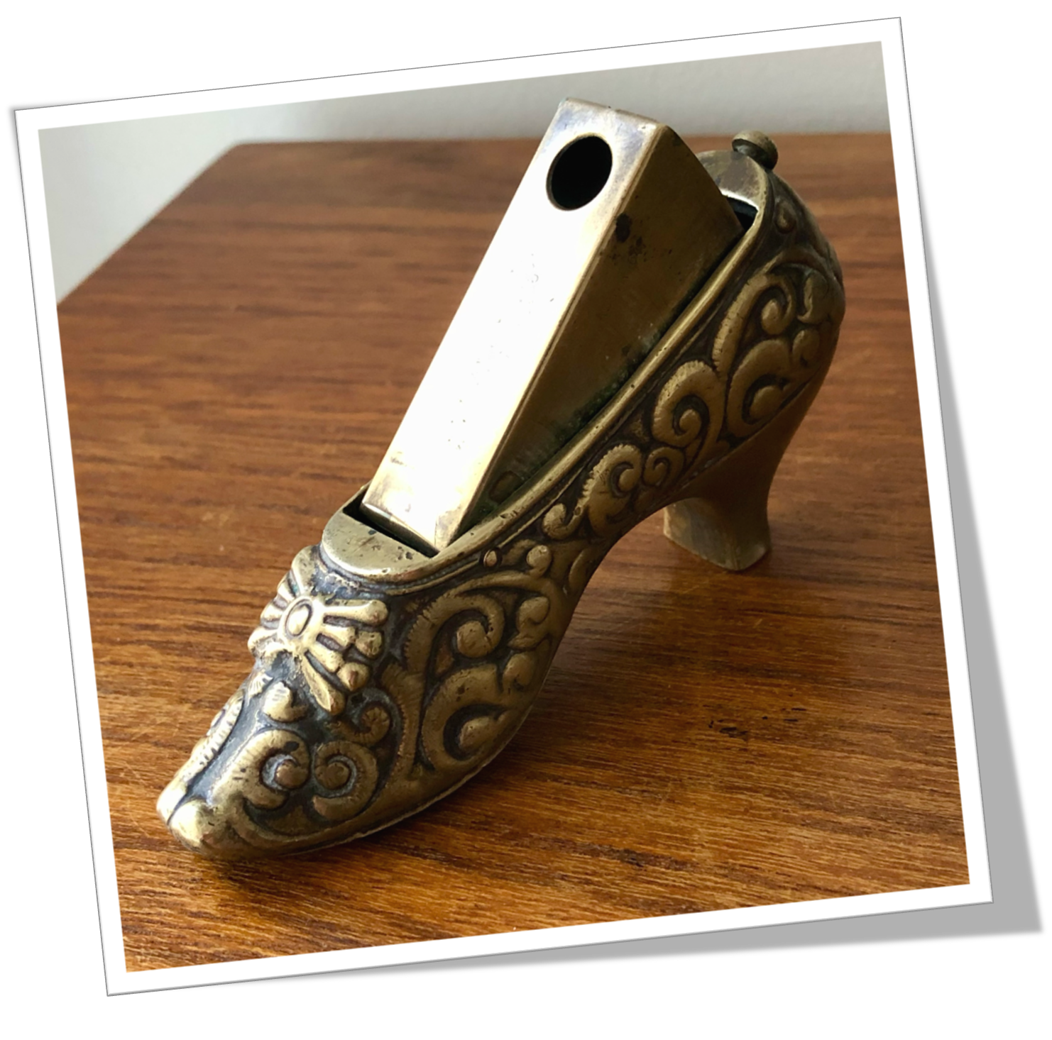 Coupe-Cigare de poche En laiton et de style Novelty Viennois. En forme de soulier, chaussure de dames à talon orné et avec un noeud papillon.Guillotine actionnée par pression.