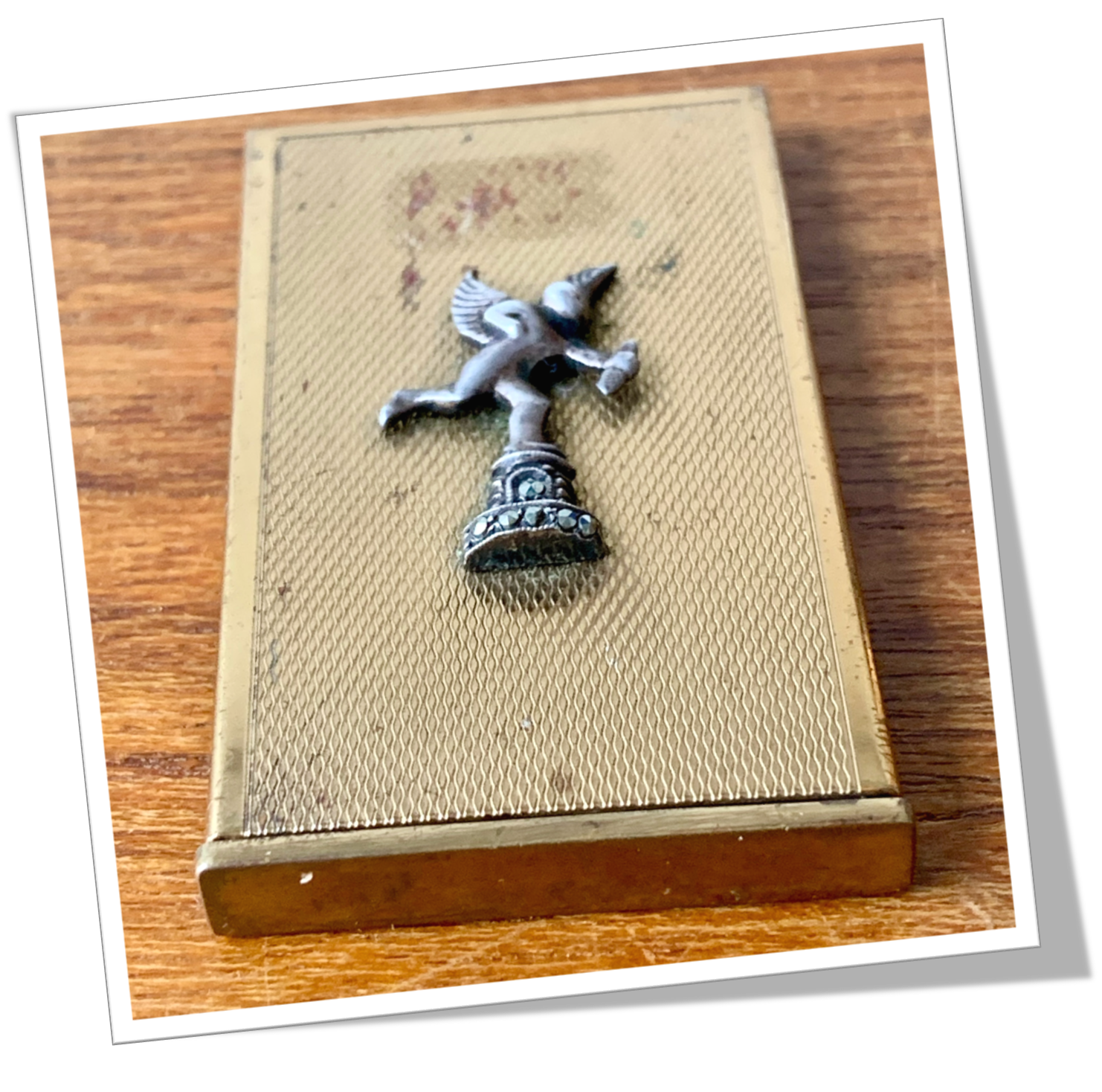 En métal doré et de forme rectangulaire. Guillochage « linéaire » avec un éros appliqué au recto. Intérieur en marchasite. De style Art Deco.