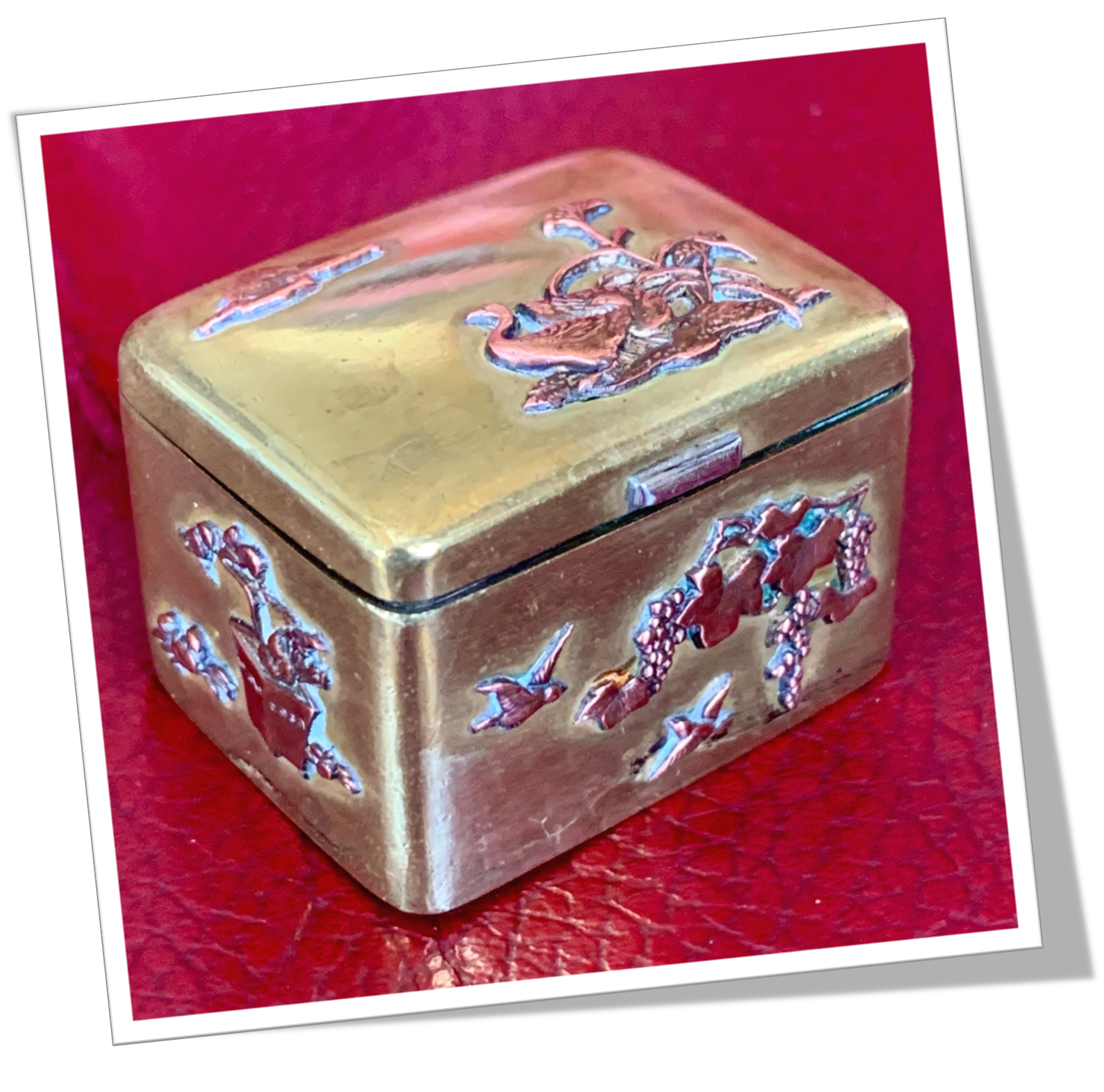 Tabatière de poche En laiton et de forme rectangulaire. Rehaussée de motifs en cuivre, appliqués et en technique « repoussé », représentant des scènes de style japonisant avec une libellule et des fleurs, des crabes et une plante, un oiseau survolant une vigne, des oies au bord du lac et, un papillon à l’approche d’un buisson.Capot 1/5 4/5.