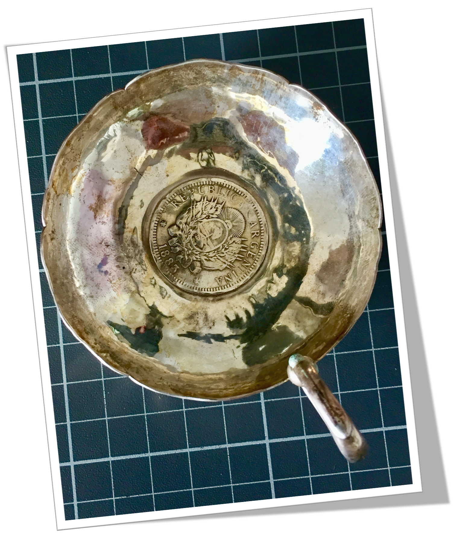Coupelle en argent 925, légèrement martelée. Pièce en argent 900, 50Cts., Argentine 1883, au centre au fond.