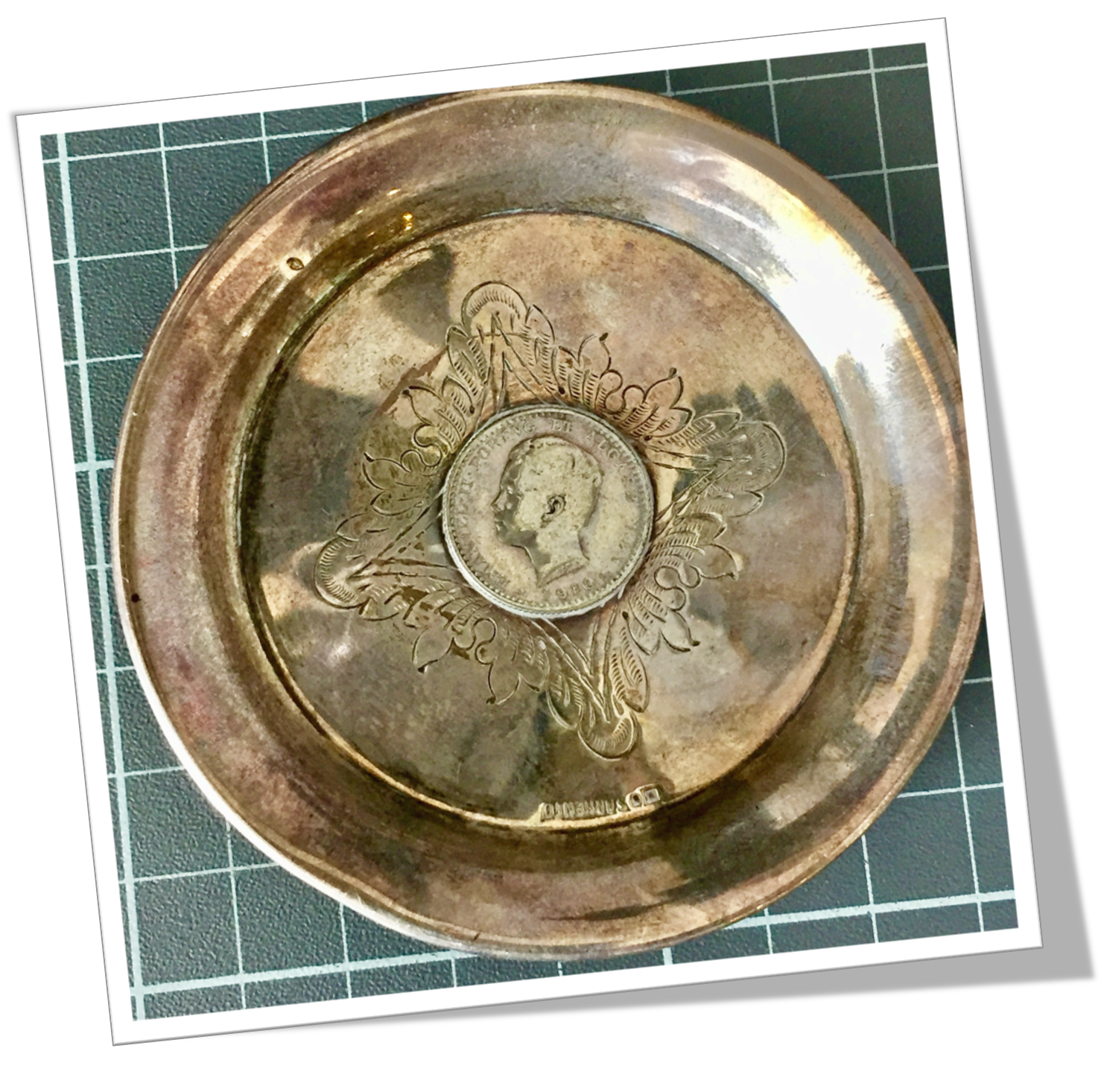 Coupelle en argent 925, large et peu profonde.pièce en argent 900, Emanuele II, Portugal 1910, au centre au fond.