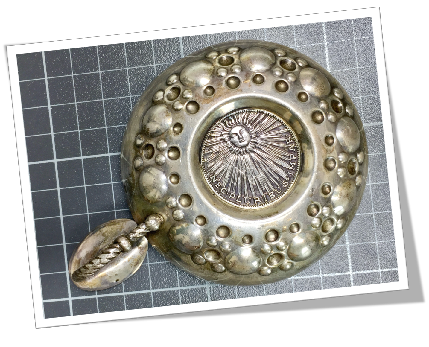 Tastevin Coupelle en métal argenté à relief de motifs classiques en technique « repoussé ». Jeton Louis XIIII Roi Soleil, France, au centre au fond. Anse torsadée.Anse anneaux vertical et repose pousse.