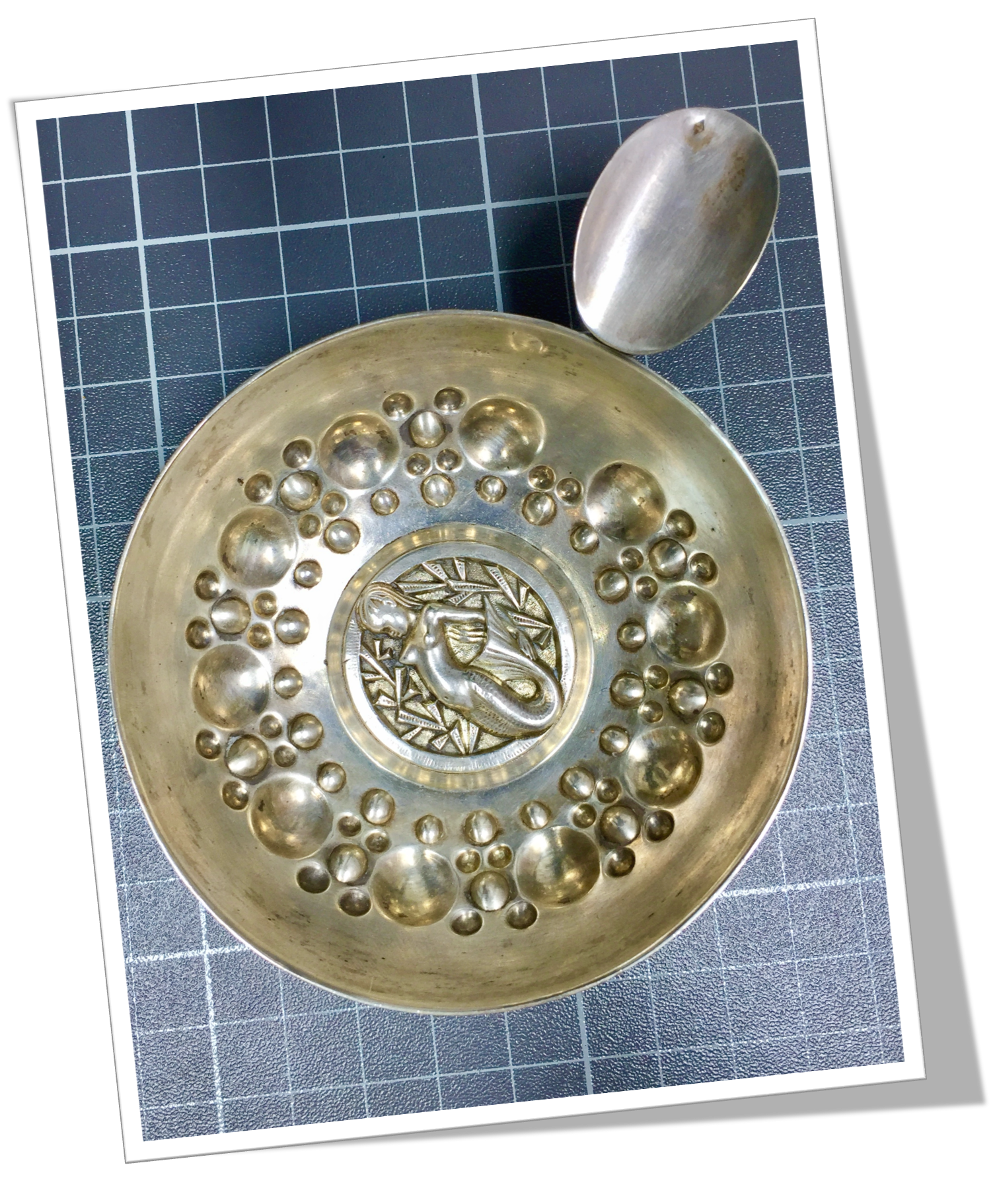 Tastevin Coupelle en métal argenté à relief de motifs classiques en technique « repoussé », agrémentée en son centre d’un relief de style Art Deco représentant une « Sirène Africaine » posant sur fond de feuillage.Anse anneau vertical torsadé avec repose-pousse.