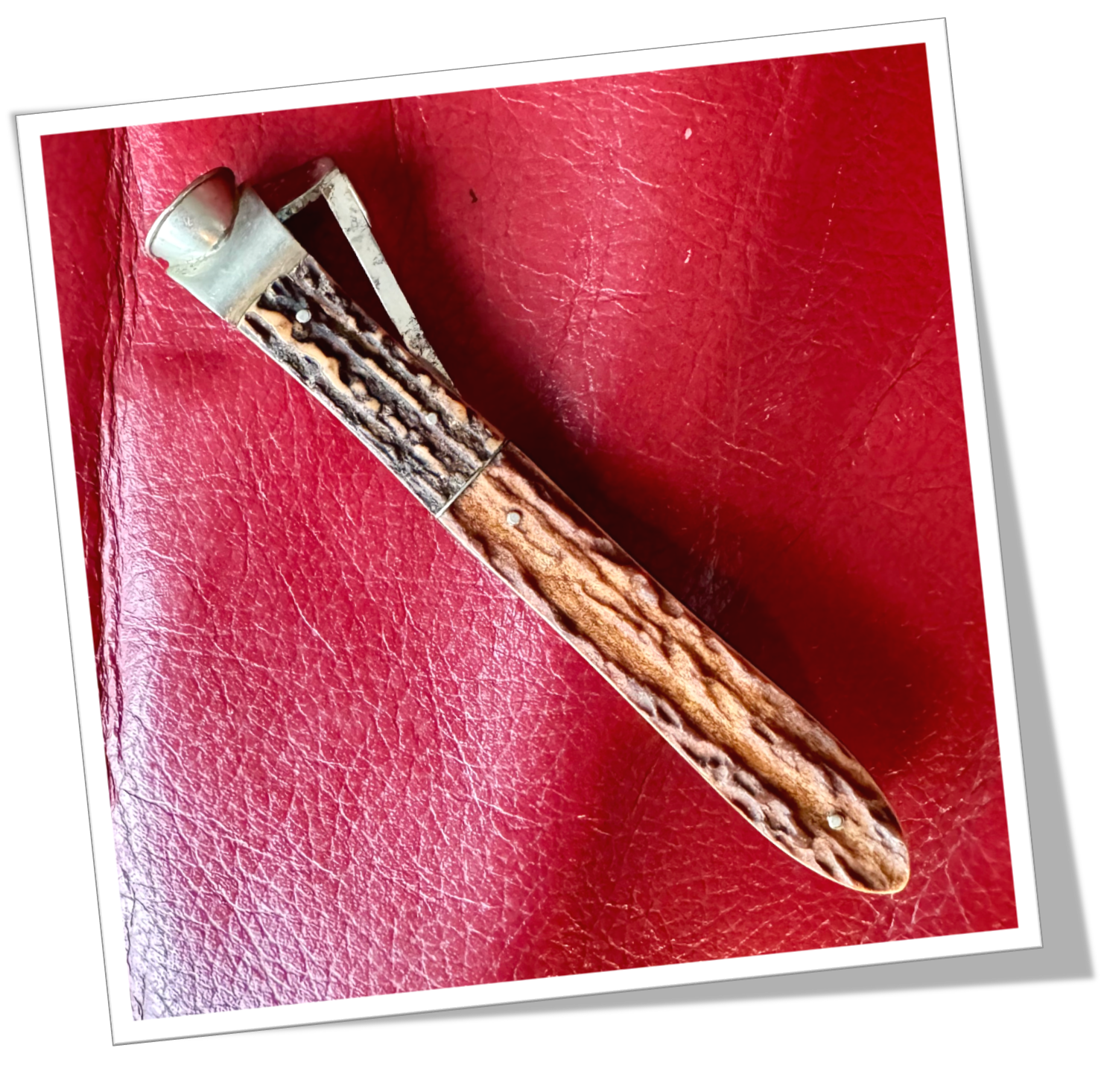 Coupe-Cigare de table Côtes rivetées en bois de cerf. Talon en pointe. En acier. Manche long à tête ancienne de type Cat-Eye (V-Cut), rehaussée d’un bouton circulaire à sillons. 13cm.