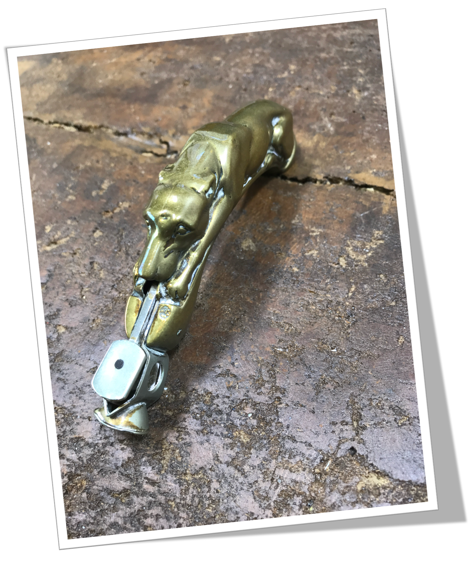 Coupe-Cigare de table En laiton et de style Art Deco, moulé et texturé en technique « repoussé » en forme de chien braque allongé.En acier chromé. Manche long agrémenté d’une tête transition, de type Cut-Eye (V-Cut) + Straight-Cut. 12cm.