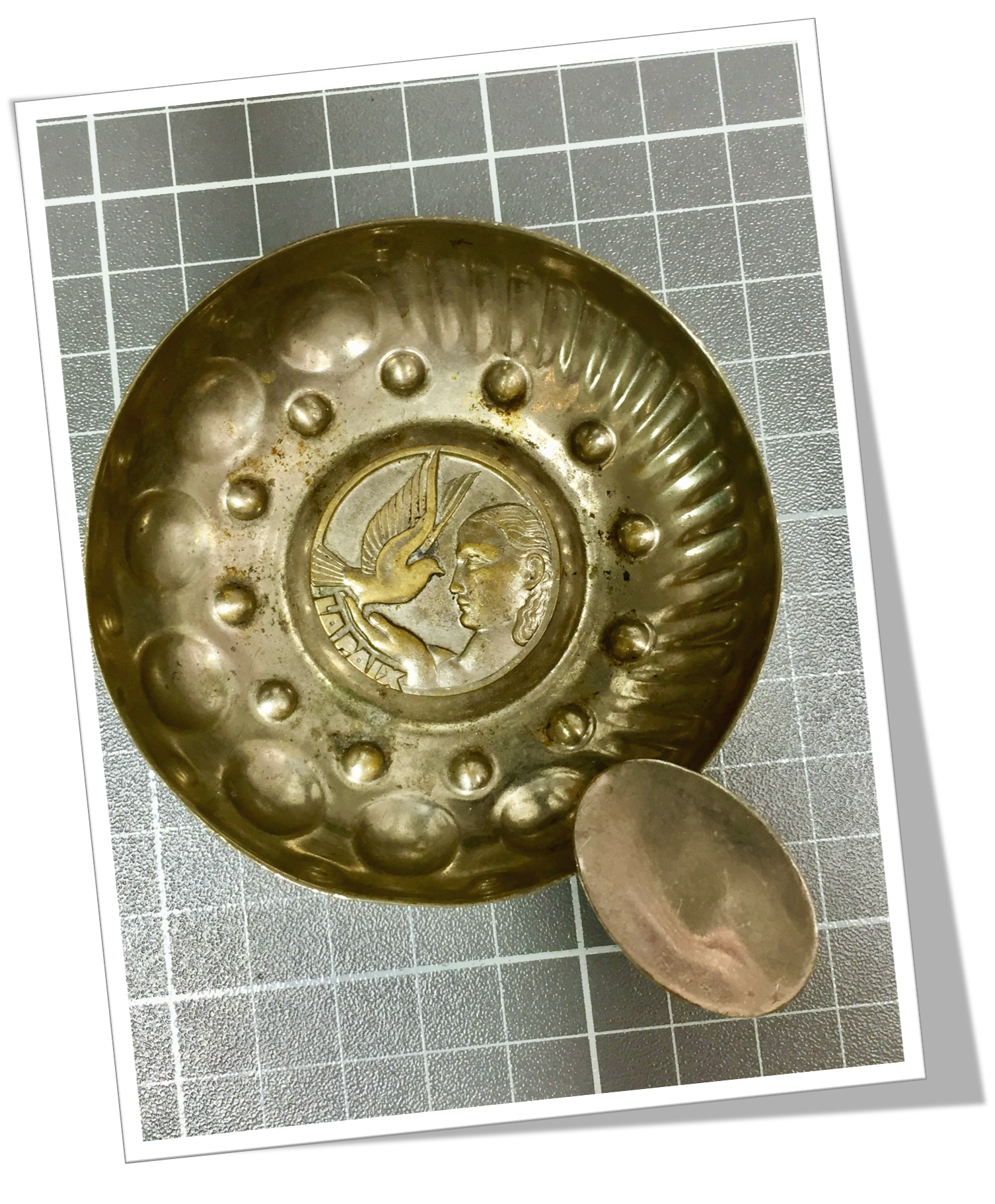 Coupelle en métal argenté à relief de motifs classiques en technique « repoussé ». Médaille « La paix » de style Art Deco au centre.