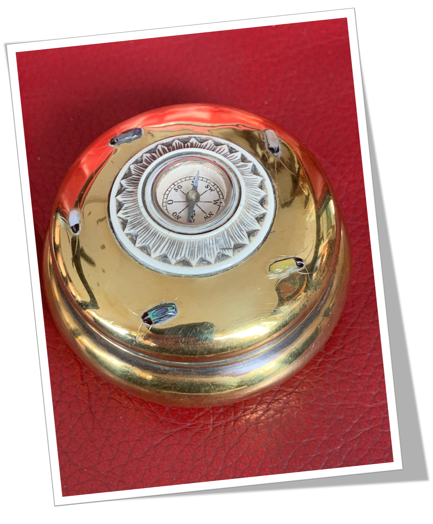 Vide-poche En laiton et de forme circulaire. Agrémenté sur son couvercle d’insectes de style Shibayama, appliqués autour d’une boussole intégrée, rehaussée d’un encadrement ciselé en résine.Couvercle 1/2 1/2. Boussole intégrée.