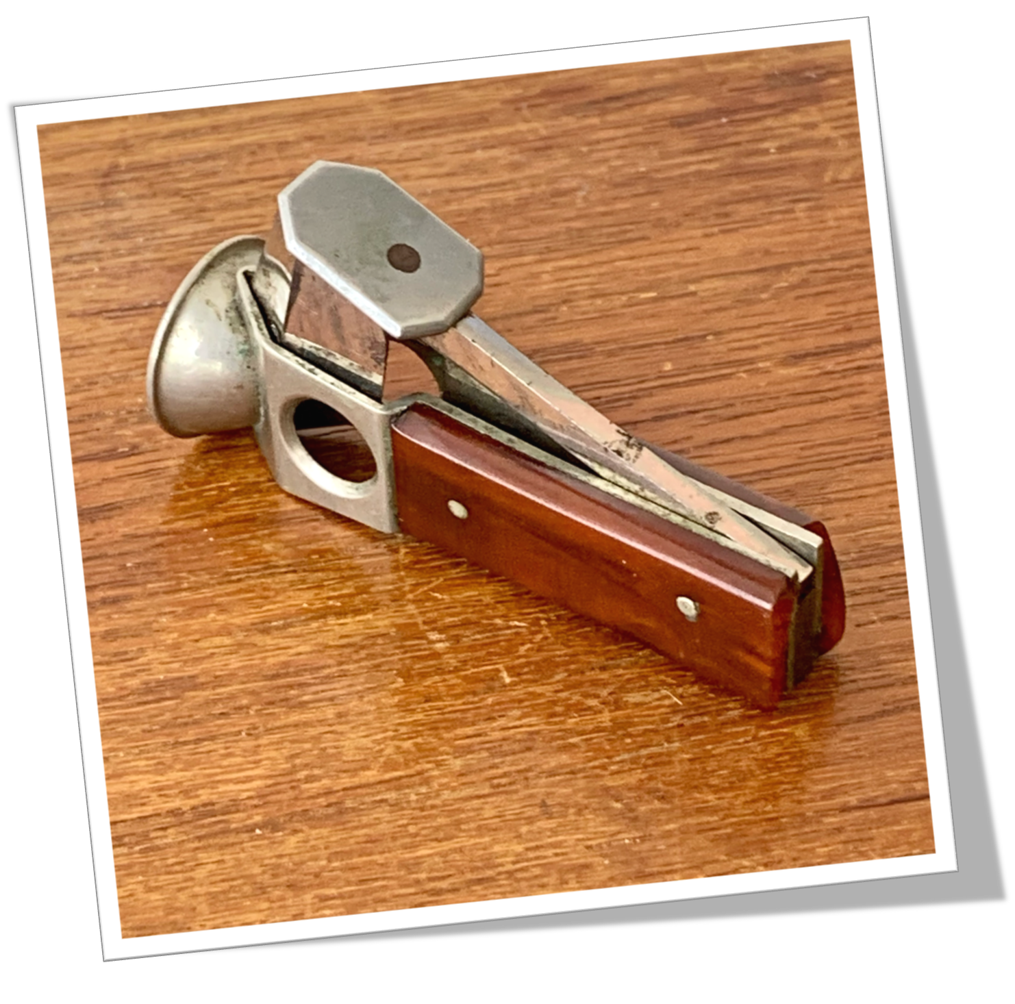 Coupe-Cigare de poche Côtes rivetées en agate.En acier chromé. Manche court agrémenté d’une tête transition, de type Cat-Eye (V-Cut) + Straight-Cut. 9cm.