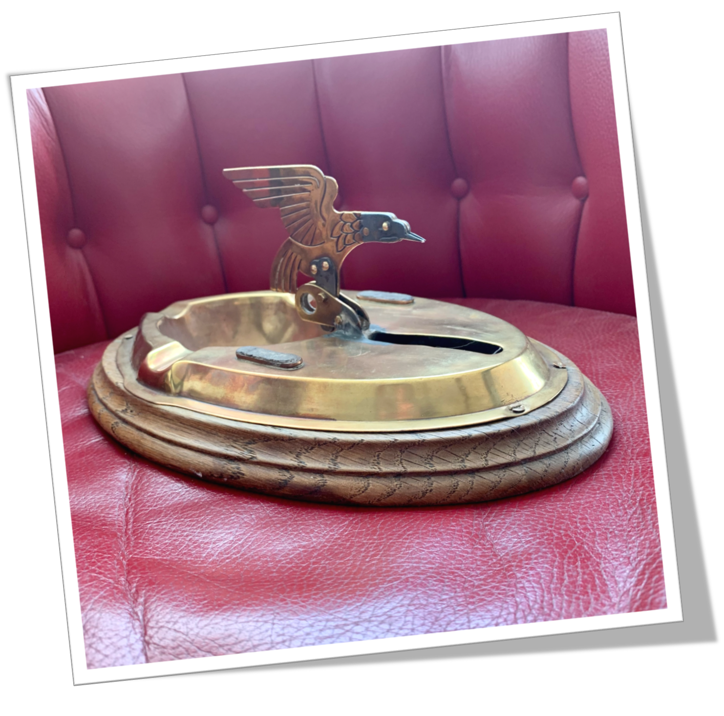 Coupe-Cigare de table En laiton, un aigle de style Art Deco ornant un cendrier monté sur un socle en bois.Guillotine à ressort. Pique récupérateur. Container à allumettes à l’avant du socle, permettant la récupération individuelle d’allumette par le bec de l’oiseau.