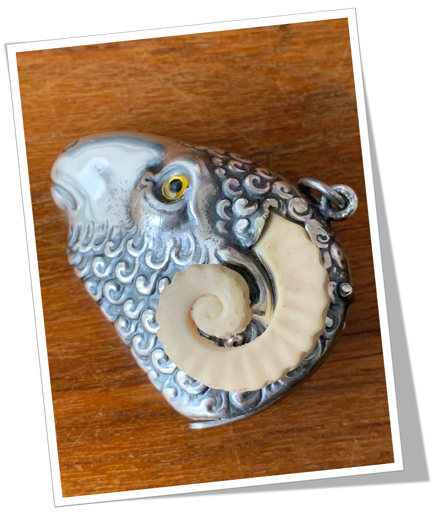 En métal argenté et de style Novelty animalier. Moulé et texturé en forme de tête de bélier agrémentée de cornes en résine façon ivoire. Yeux jaunes en verre.