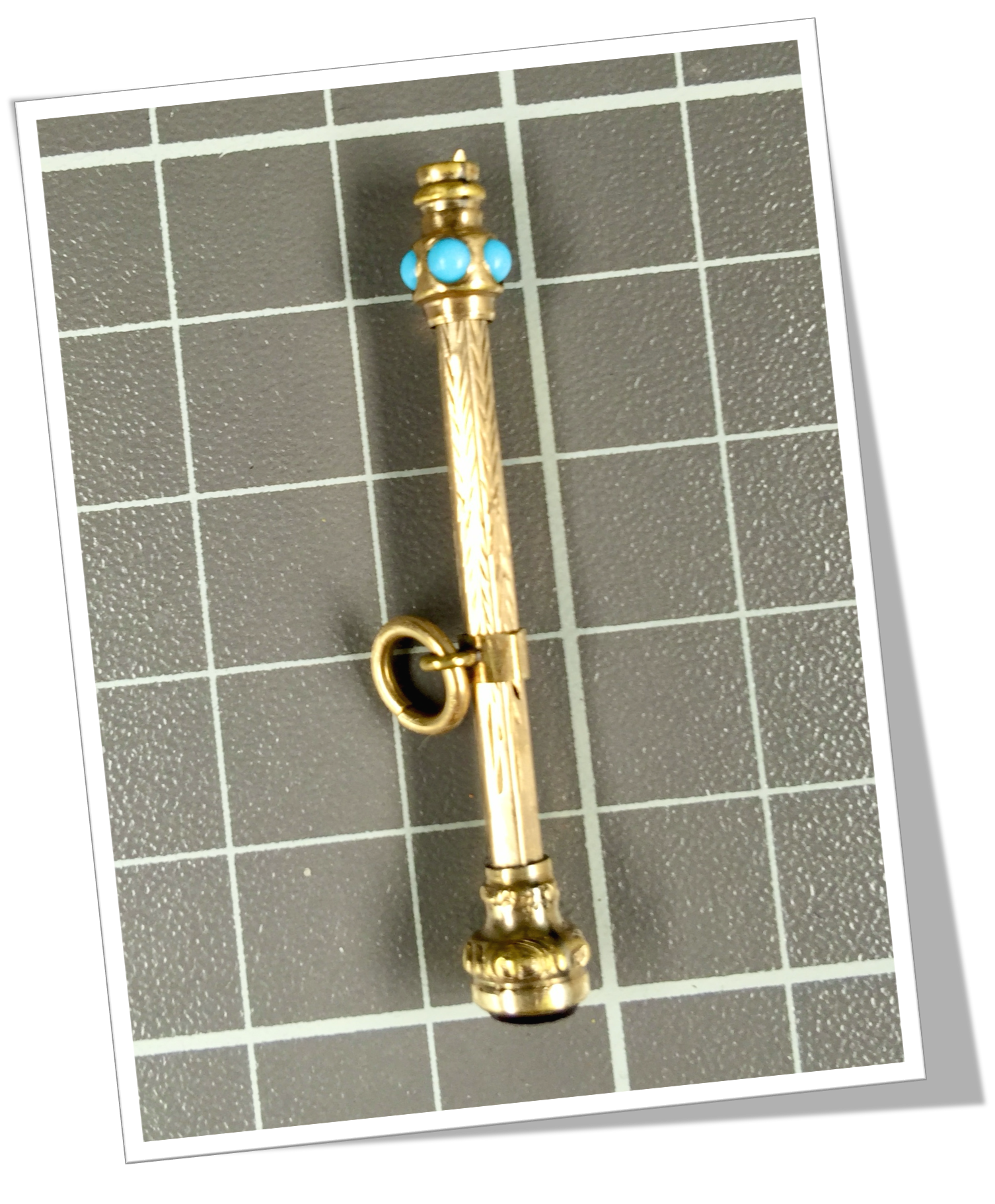 Cure-dents En or 9ct et en forme de Sceptre. Guillochage « linéaire ». Turquoise et cabochon améthyste sertis.Pique lance rotatif. Bélière.