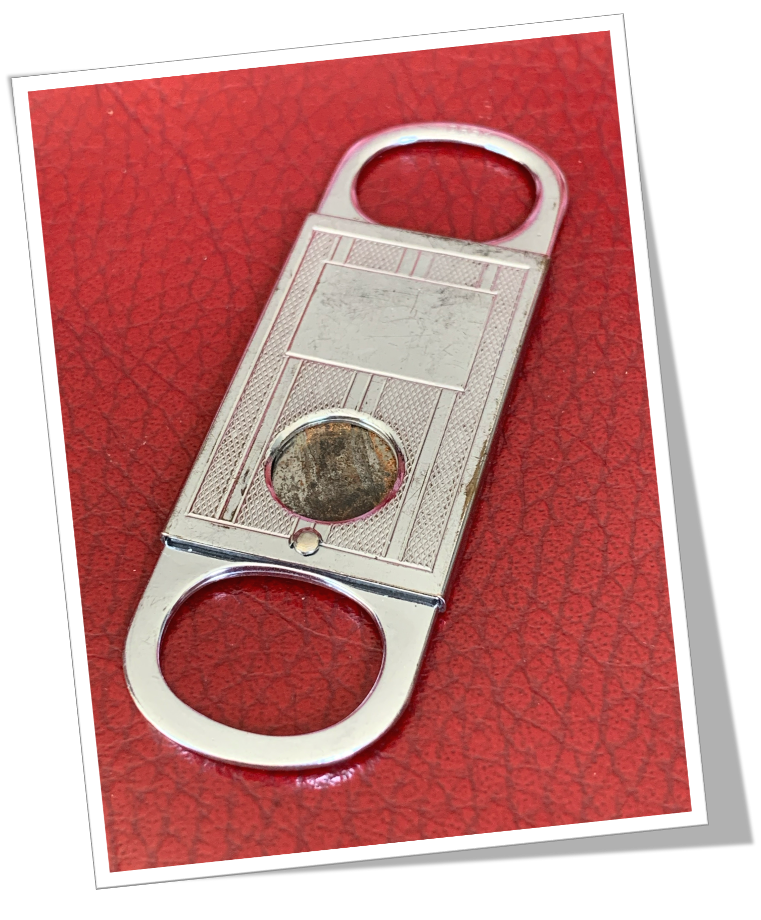 Coupe-Cigare de poche En métal argenté, rehaussé d’un guillochis « strié fin » en bandelettes, agrémenté au recto d’un cartouche rectangulaire vierge.Guillotine à double prises semi-circulaires latérales. Hublot circulaire. 6cm
