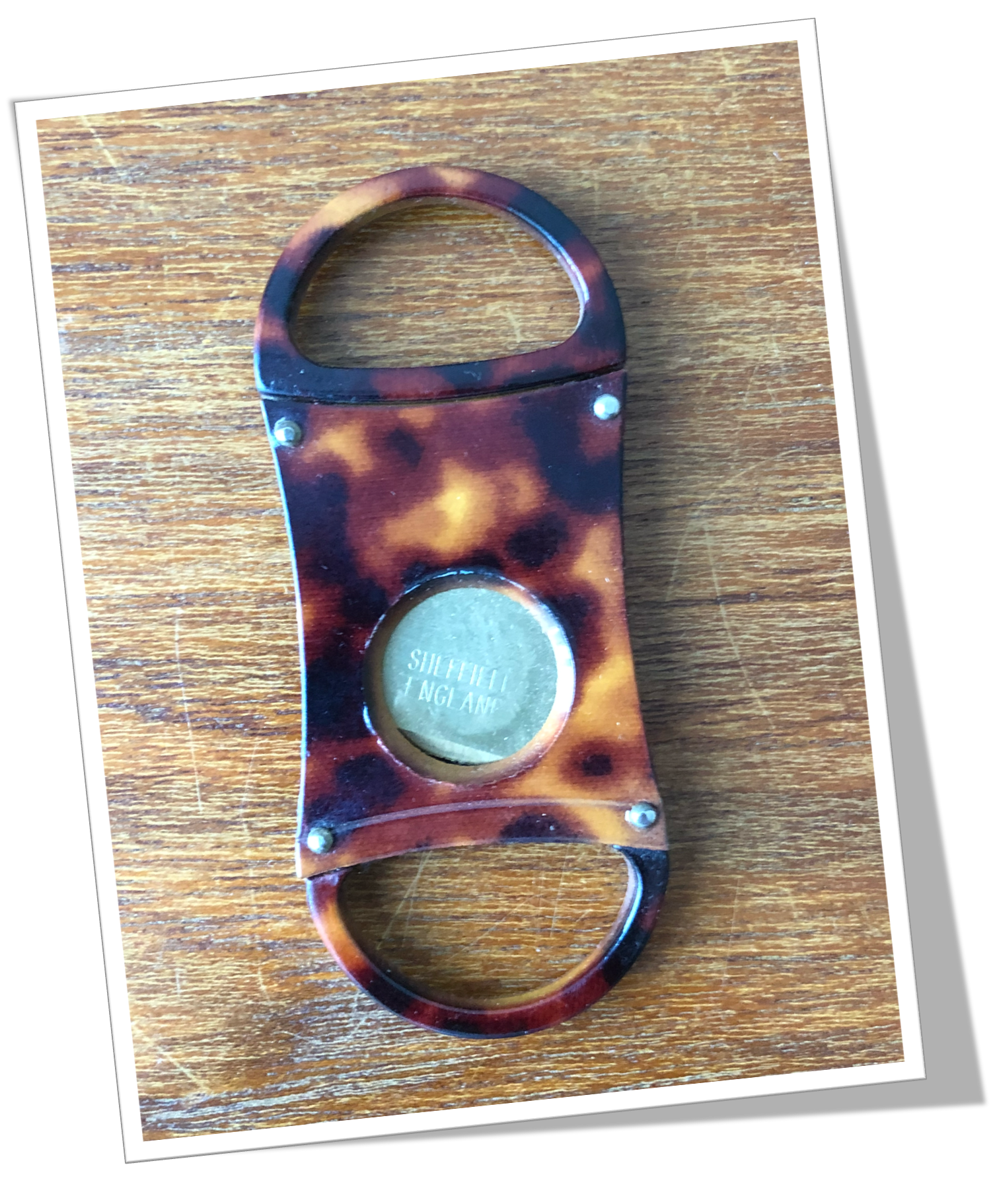 Coupe-Cigare de poche Côtes rivetées en fausse écaille de tortue.Double guillotine. Double prise semi-circulaires latérales en résine noire. Hublot circulaire. 8cm.