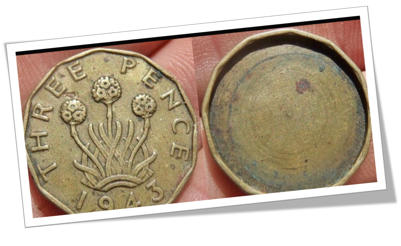 Monnaie de Bagnard Pièce en alliage tranchée et vidée. George VI Three Pence 1943, Grande Bretagne.Couvercle à emboîtement forcé.