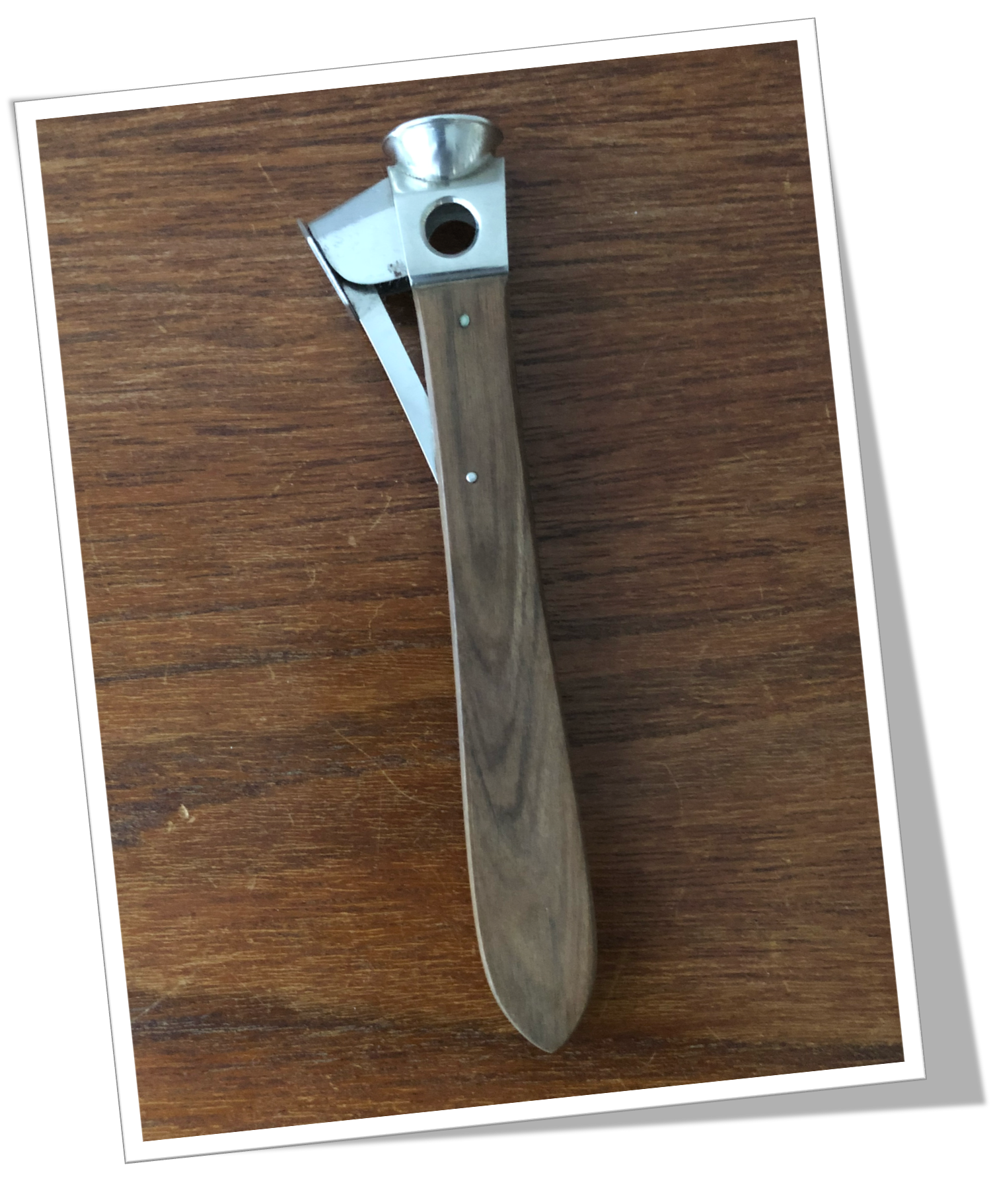Coupe-Cigare de table Côtes rivetées en bois de noyer claire. En acier. Manche long agrémenté d’une tête transition, de type Cut-Eye (V-Cut) + Straight-Cut. 15cm.