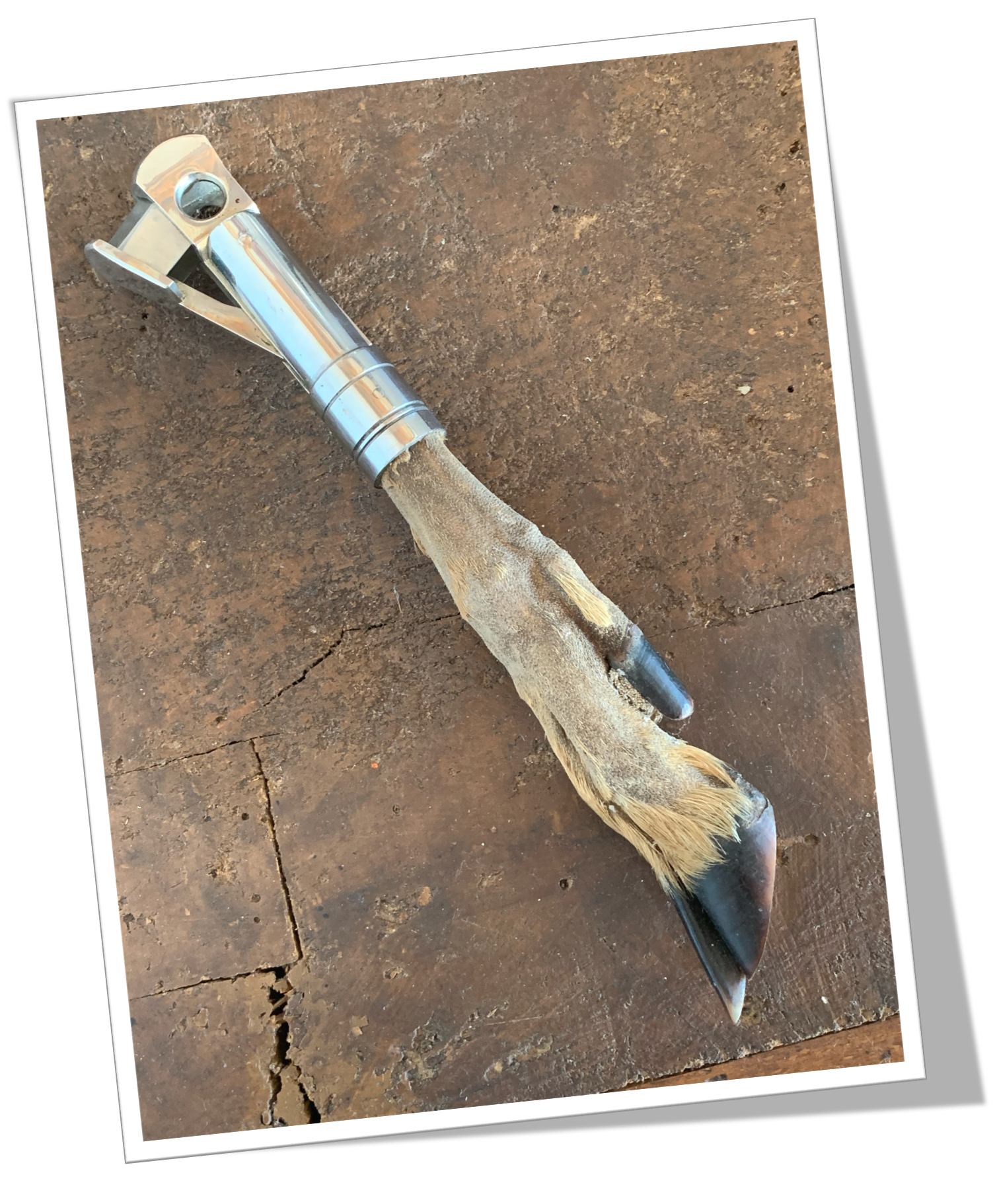 Patte de biche rehaussée d’une robe en acier chromé. Thème de la chasse.