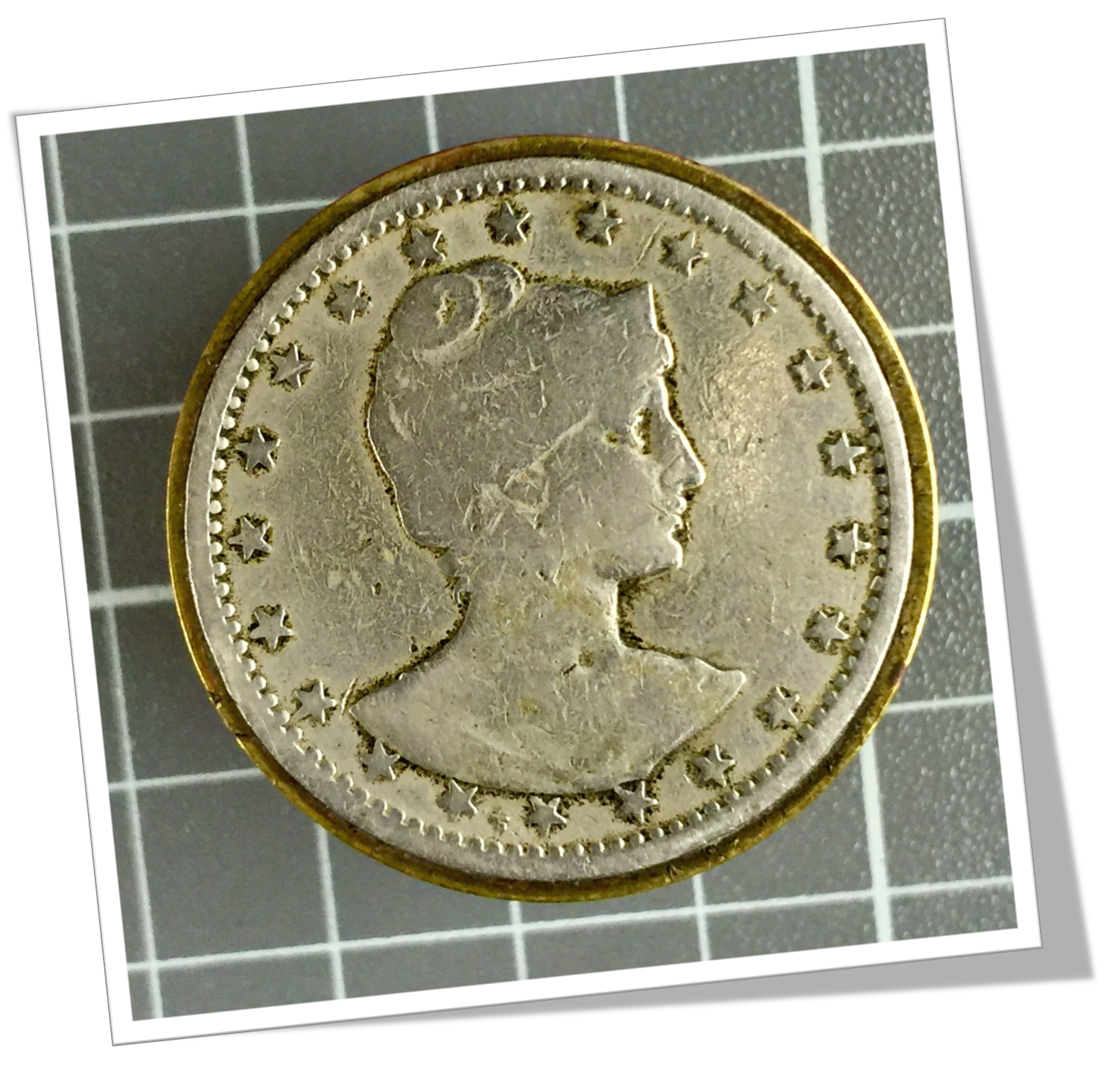 En laiton et de forme circulaire. Agrémenté de deux pièces appliquées. 400 REIS MCMI, Brésil 1901.