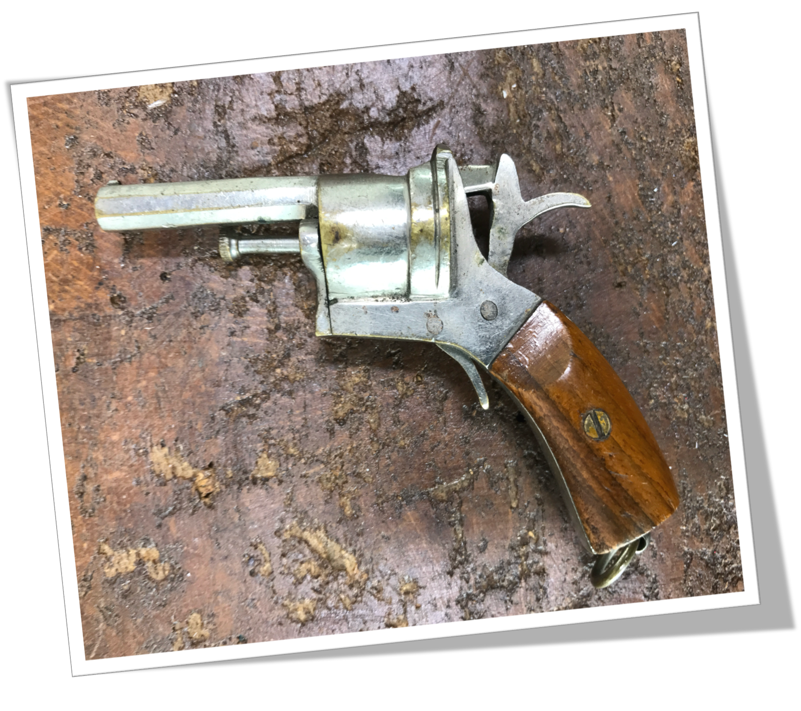 De style Novelty. Pistolet, revolver en métal argenté, agrémenté d’une poignet en bois miel.