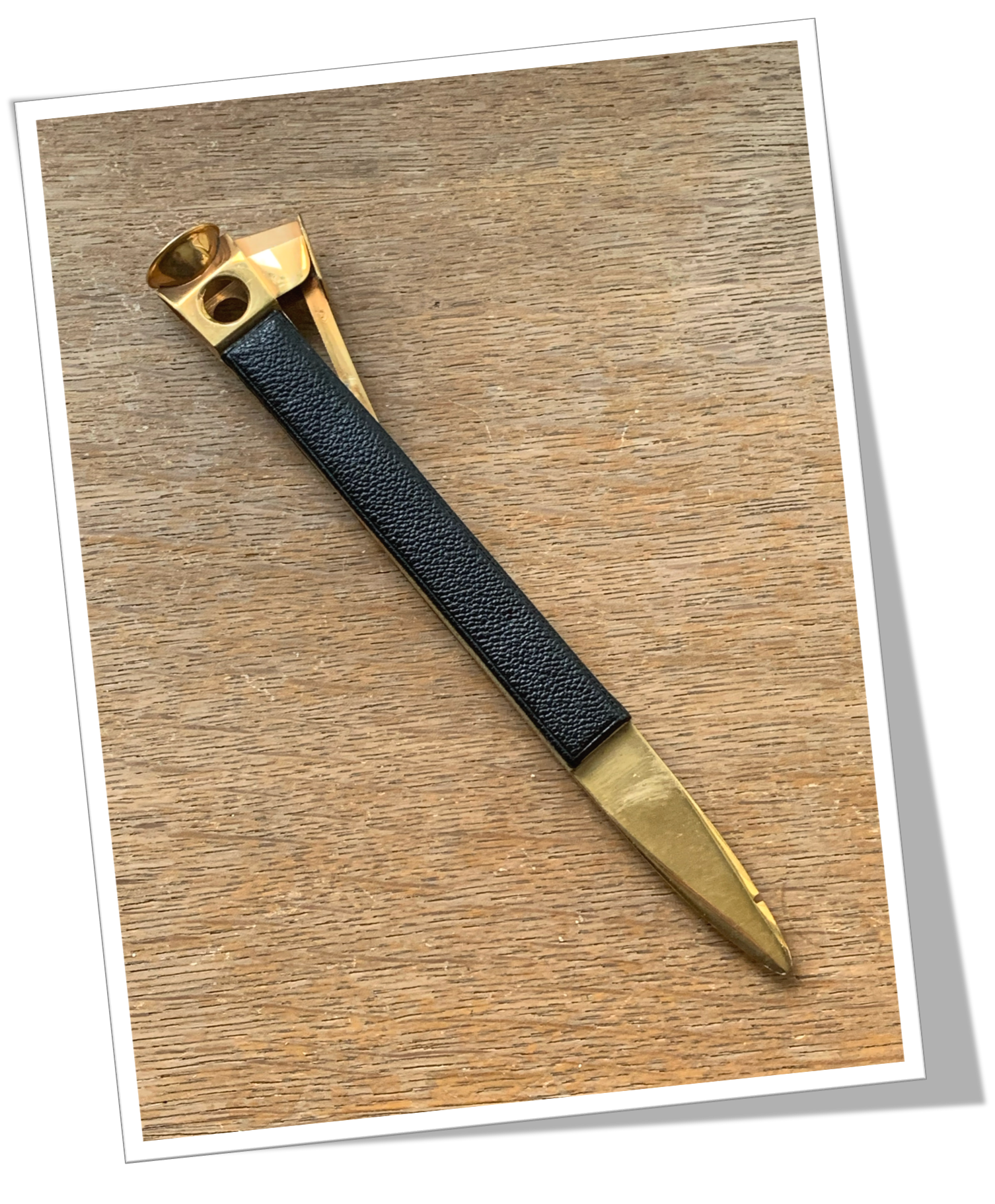 Coupe-Cigare de table Côtes gainés de similicuir noir.En métal doré. Manche long agrémenté d’un « pied de biche » pointu et d’une tête transition, de type Cut-Eye (V-Cut) + Straight-Cut. 17cm.