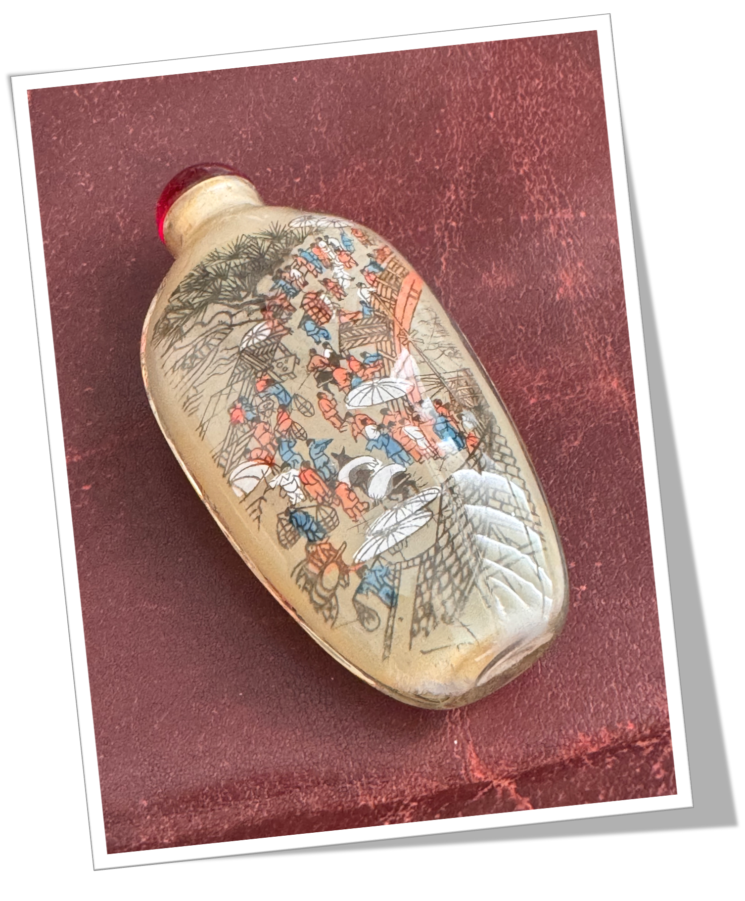 Tabatière de poche En pâte de verre et en forme de bouteille. Rehaussé d’une œuvre peinte à la main de l’intérieur, représentant des scènes de grand marché de centre ville. 62,4gBouchon rouge.
