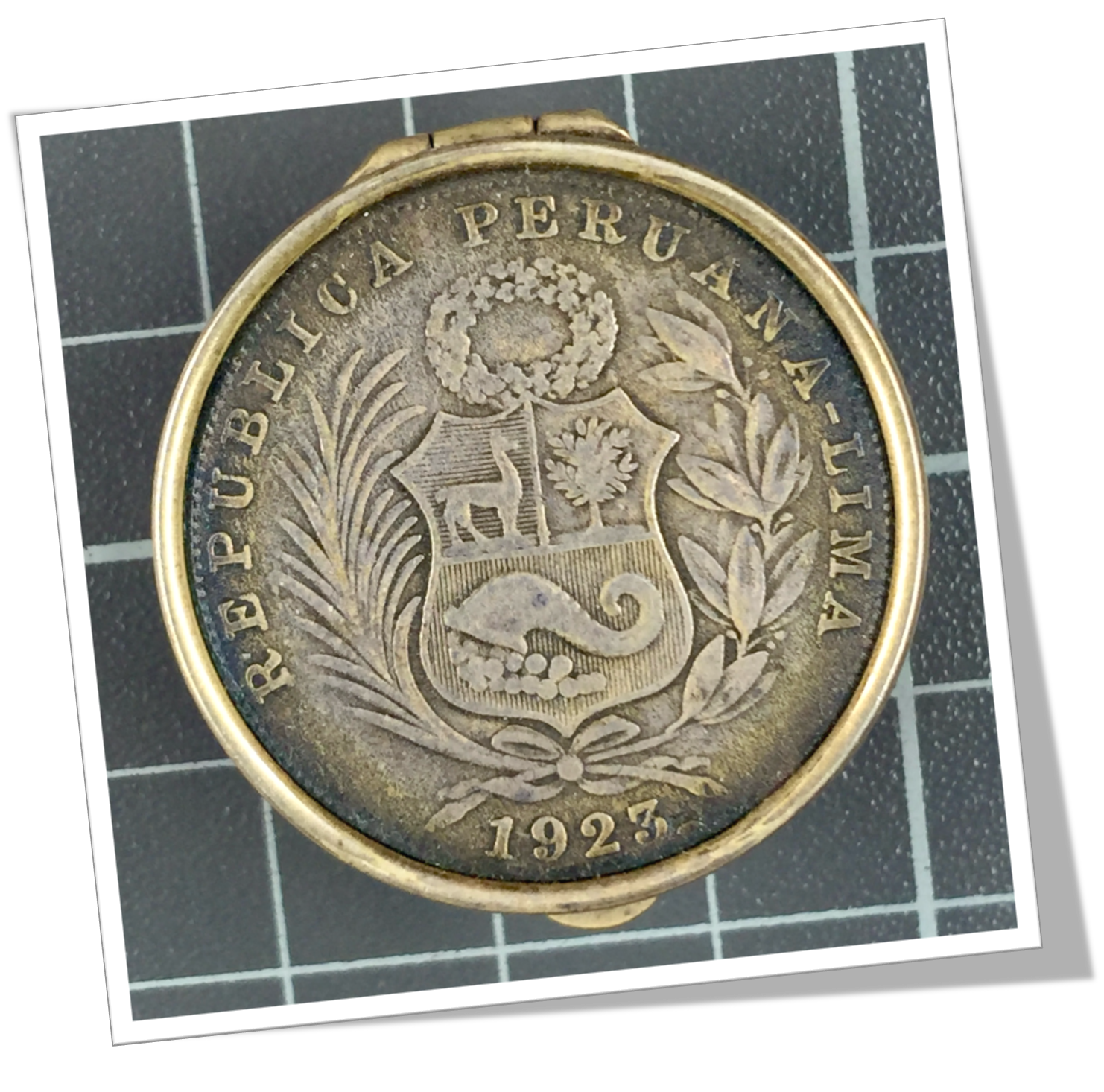 Tabatière de poche En argent 925, agrémentée au recto d’une pièce en argent 900 appliquée. Un Sol, Pérou 1923.Capot à charnière 1/5 4/5.