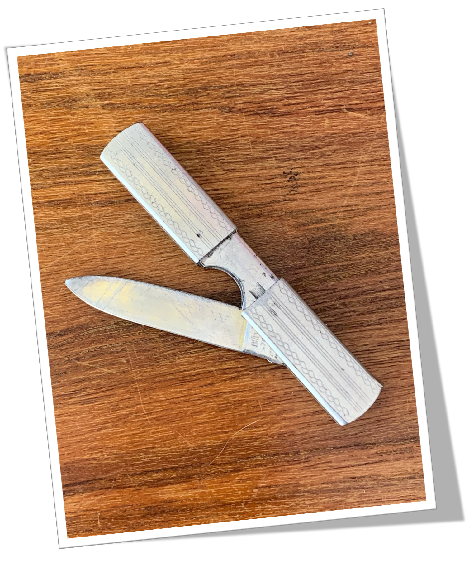 Couteau canif En métal argenté, rehaussé d’un guillochis « linéaire » agrémenté de bandelettes « striées fin ».1pcs+: Lame pliante. Creux coupe-cigare. 9cm.