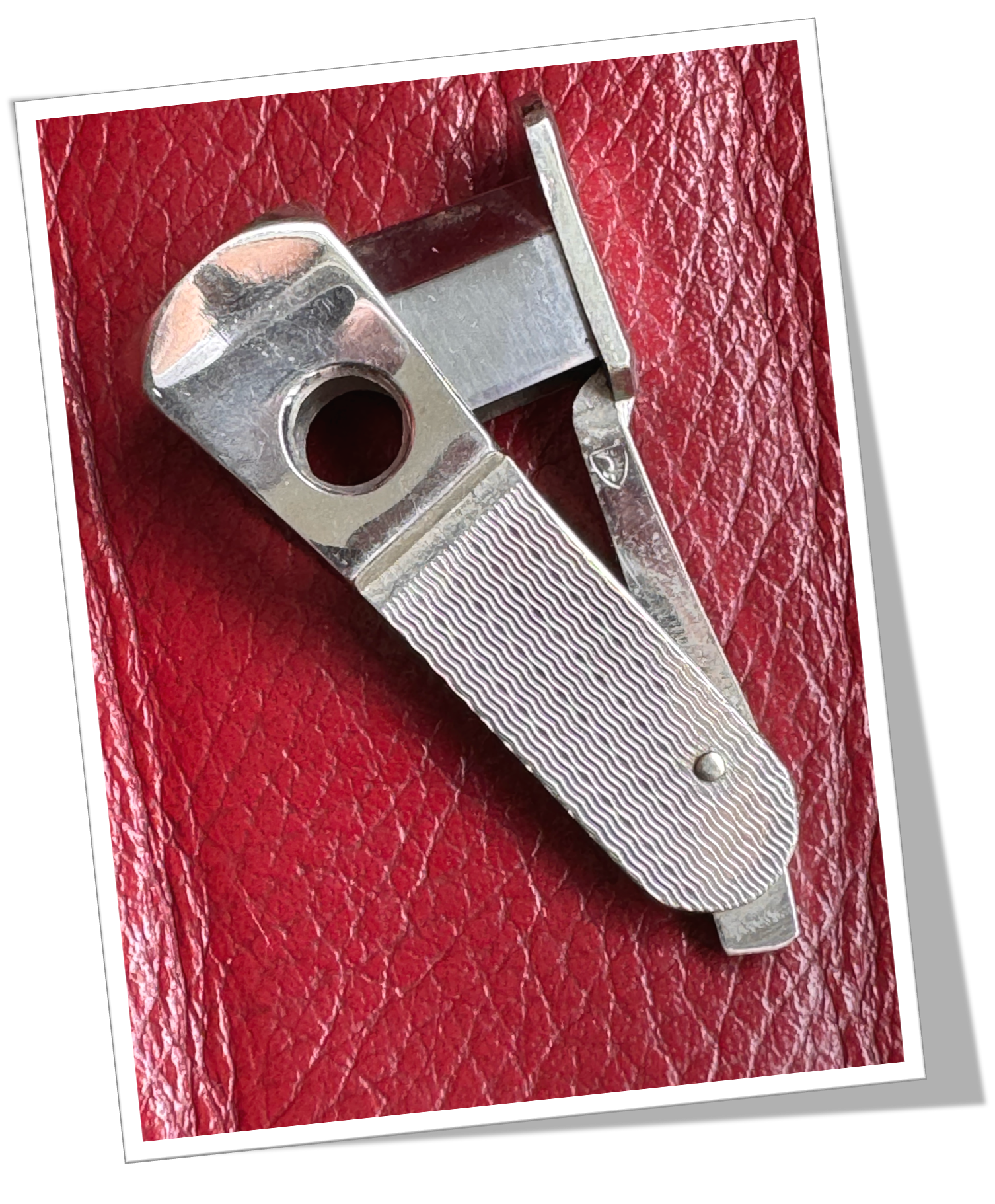 Coupe-Cigare de poche Côtes rivetées en métal argenté, rehaussées d’un guillochis « linéaire ».En acier chromé. Manche court agrémenté d’un « levier » et d’une tête moderne de type Cat-Eye (V-Cut) + Straight-Cut. 6cm.