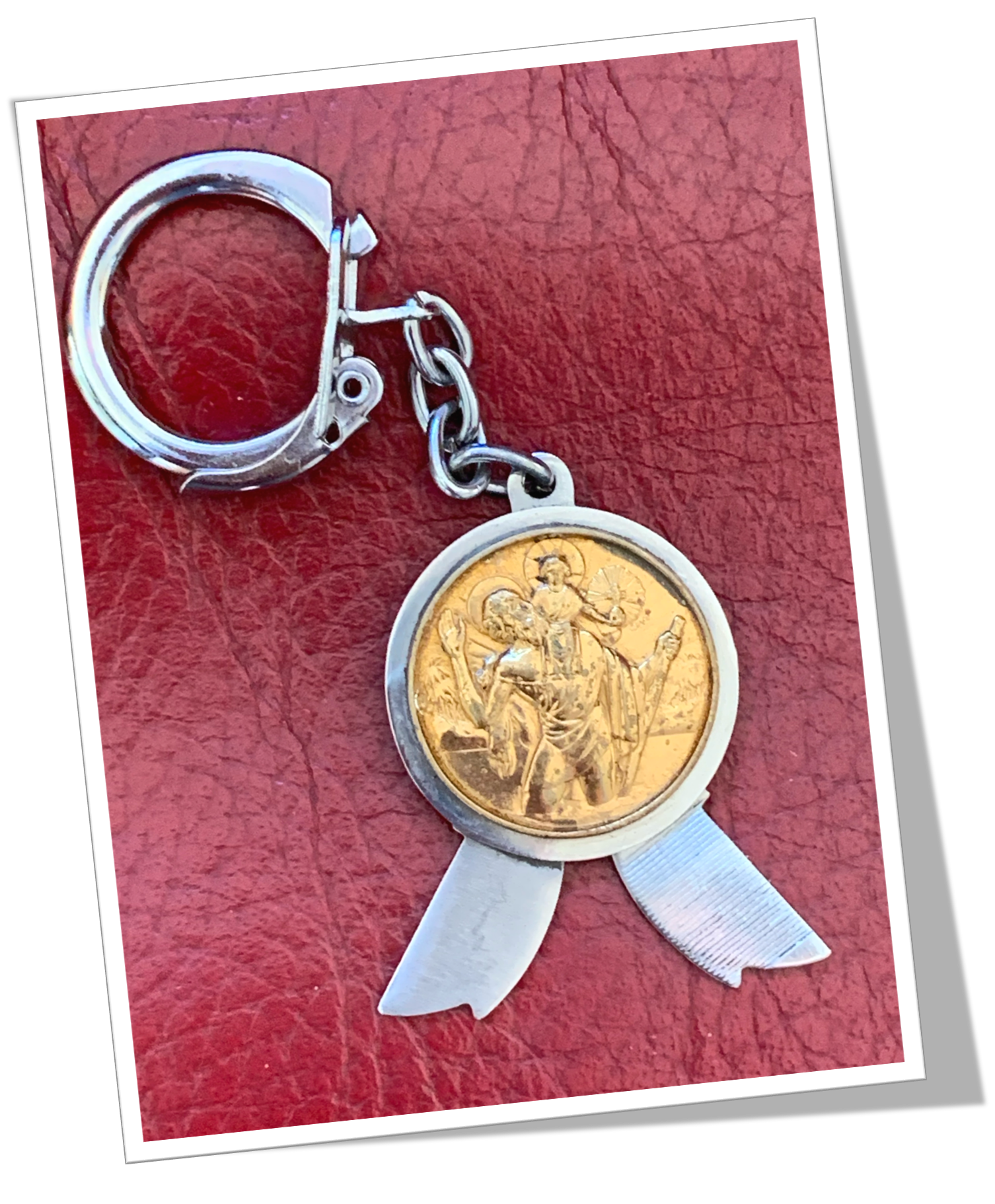 Canif rond Cotés circulaires en acier chromé, appliquées. Médaille en laiton de Saint Christophe portant le Christ en relief au recto. Plaquage doré.2pcs: Lame et lime de type « NOGENT ». Porte clés.