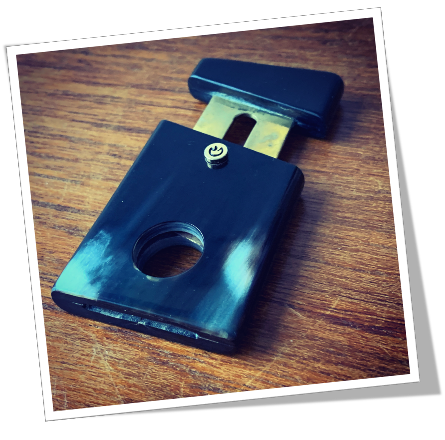 Coupe-Cigare de poche En corne noire et de forme rectangulaire. Agrémenté au recto d’un rivet doré portant une signature.Guillotine à collerette invisible.
