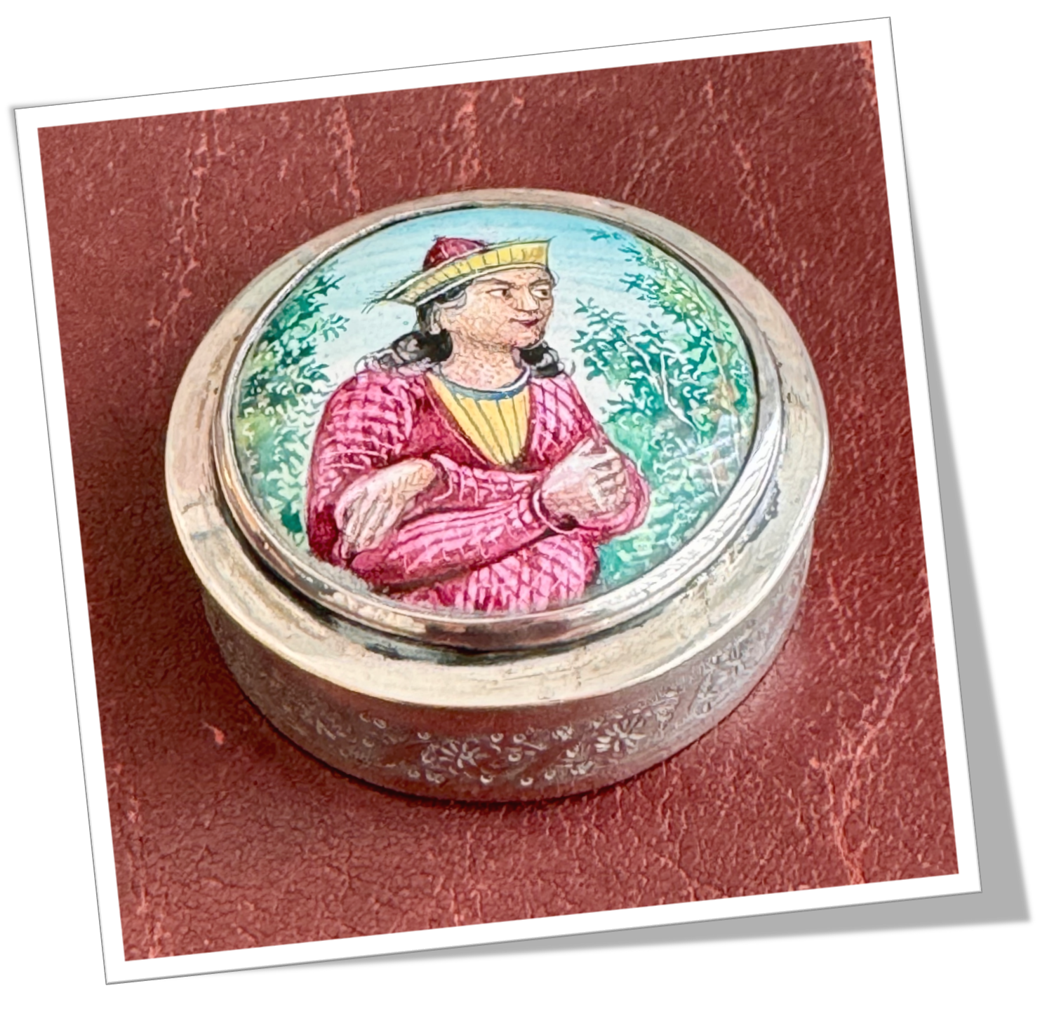 Tabatière de poche En argent 925 et de forme circulaire. Rehaussé de motifs orientaux ciselés et agrémenté sur son capot d’une œuvre émaillée peinte à la main, représentant le buste d’un homme en tenue orientale. 41,5gr.Couvercle à zéro.