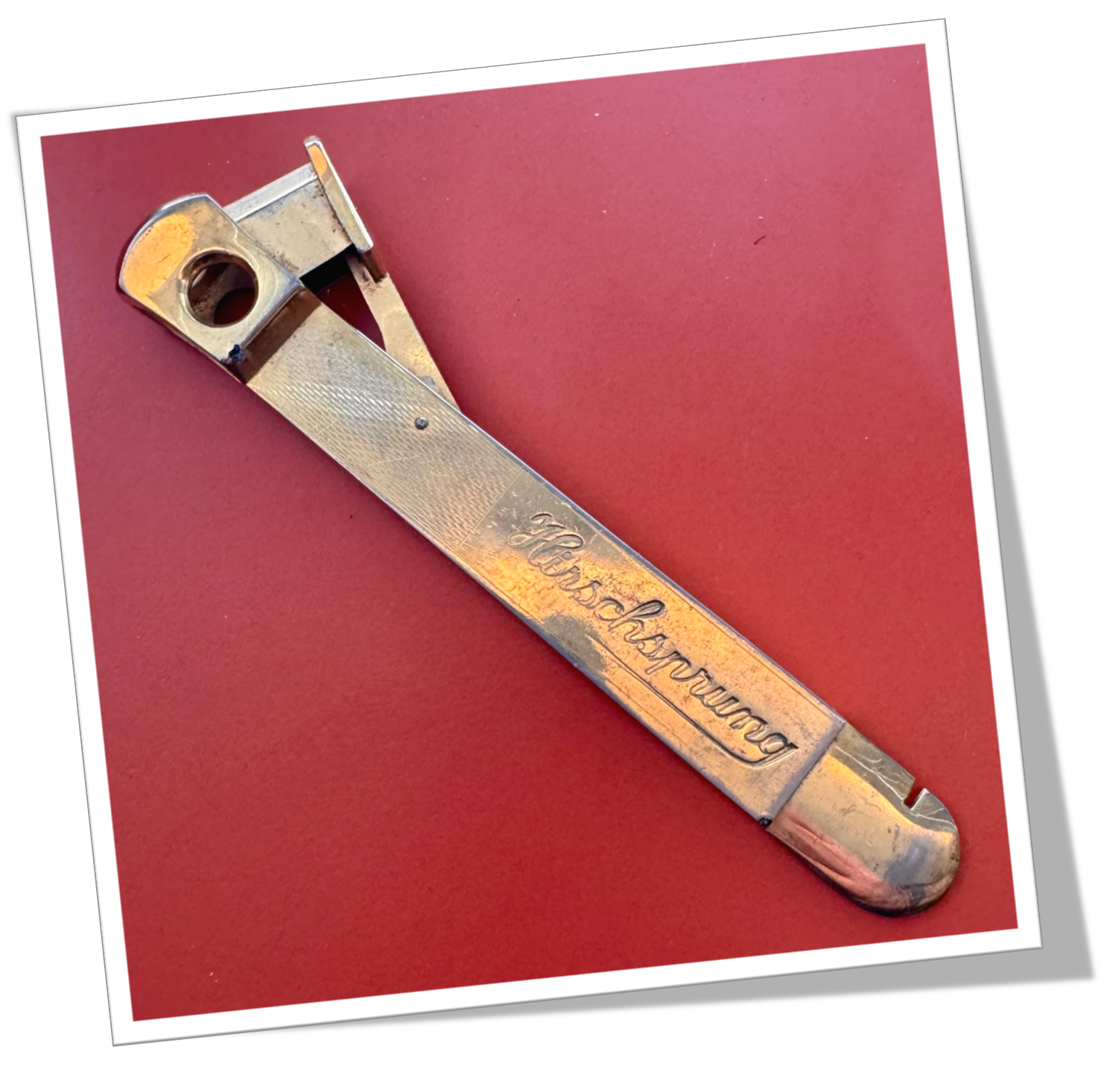 Coupe-Cigare de table Côtes appliquées en métal doré, réhaussées d’un guillochis « linéaire » et agrémentéés au recto de l’inscription « Hirschsprung ».En métal doré. Manche long agrémenté d’un « pied de biche » et d’une tête moderne, de type Cut-Eye (V-Cut) + Straight-Cut. 15cm.