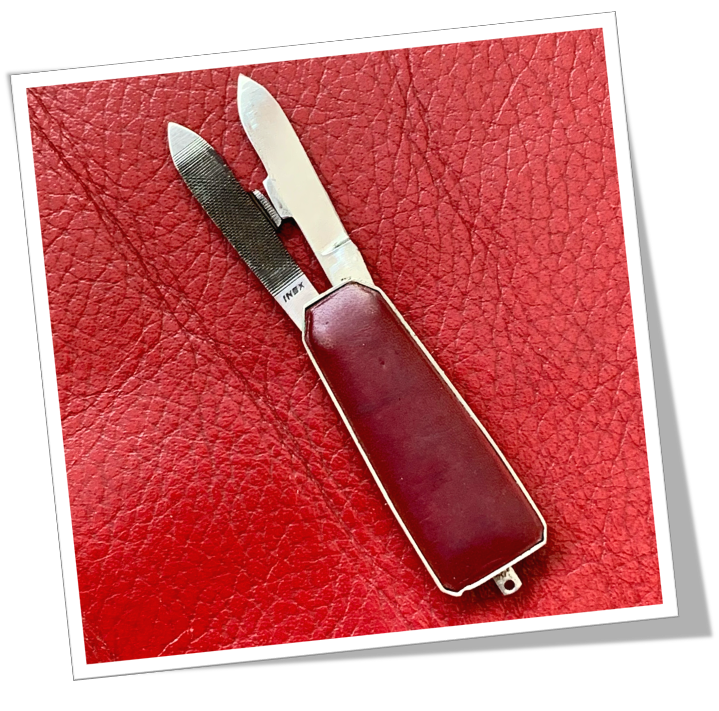 Couteau canif Côtes octogonales appliquées, en cuir bordeaux. Encadrement en métal doré.2pcs: Lame et lime. 9cm.